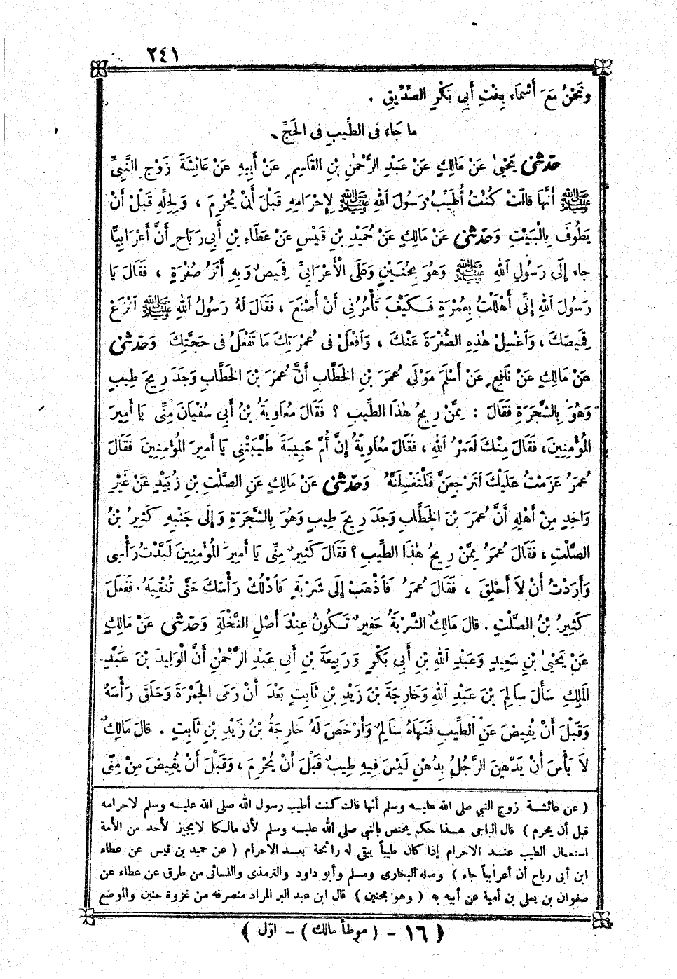[719] عَن عَائِشَة زوج النَّبِي صلى الله عَلَيْهِ وَسلم أَنَّهَا قَالَت كنت اطيب رَسُول الله صلى الله عَلَيْهِ وَسلم لإحرامه قبل أَن يحرم قَالَ الْبَاجِيّ هَذَا حكم يخْتَص بِالنَّبِيِّ صلى الله عَلَيْهِ وَسلم لِأَن مَالِكًا لَا يُجِيز لأحد من الْأمة اسْتِعْمَال الطّيب عِنْد الْإِحْرَام إِذا كَانَ طيبا يبْقى لَهُ رَائِحَة بعد الْإِحْرَام