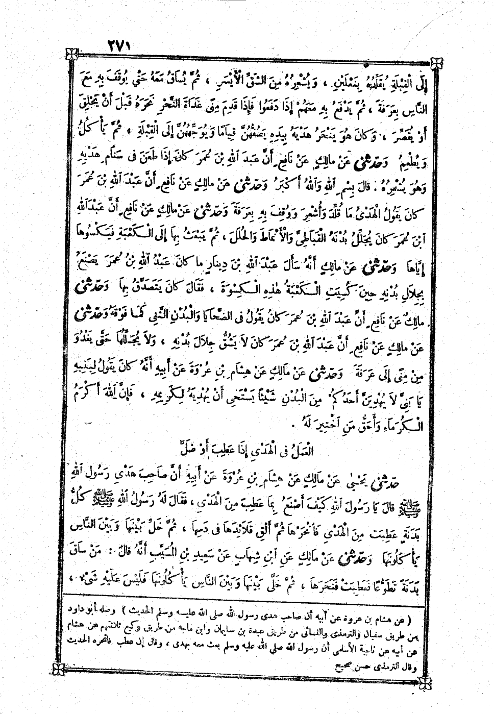 [841] عَن نَافِع عَن عبد الله بن أبي بكر بن مُحَمَّد بن عَمْرو بن حزم أَن رَسُول الله صلى الله عَلَيْهِ وَسلم أهْدى جملا كَانَ لأبي جهل الحَدِيث قَالَ بن عبد الْبر كَذَا وَقع فِي رواي يحيى وَهُوَ من الْغَلَط الْبَين وَلم يخْتَلف رُوَاة الْمُوَطَّأ أَن هَذَا الحَدِيث فِي الْمُوَطَّأ لمَالِك عَن عبد الله بن أبي بكر وَلَيْسَ لنافع فِيهِ ذكر وَلم يرو نَافِع عَن عبد الله بن أبي بكر قطّ شَيْئا بل عبد الله بن أبي بكر مِمَّن يصلح أَن يروي عَن نَافِع وَقد روى عَن نَافِع من هُوَ أجل مِنْهُ وروى هَذَا الحَدِيث سوى بن سعيد عَن مَالك عَن الزُّهْرِيّ عَن أنس عَن أبي بكر فَذكره وَهُوَ من خطأ سُوَيْد وغلطه والْحَدِيث يسْتَند من حَدِيث بن عَبَّاس أخرجه أَبُو دَاوُد من طَرِيق بن إِسْحَاق عَن عبد الله بن أبي نجيح عَن مُجَاهِد عَنهُ
