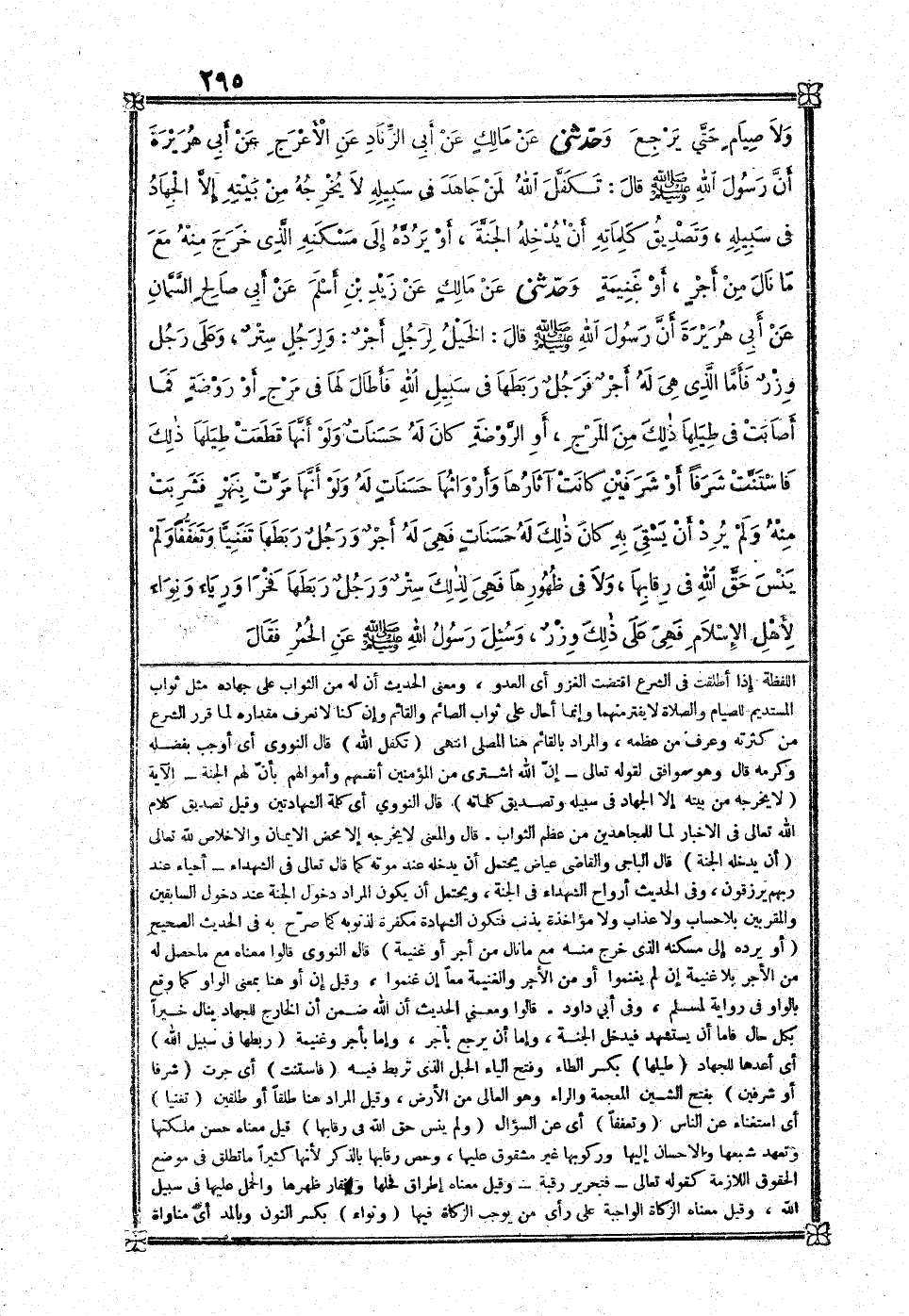 [956] مثل الْمُجَاهِد فِي سَبِيل الله كَمثل الصَّائِم إِلَى آخِره قَالَ الْبَاجِيّ جَمِيع أَعمال الْبر هِيَ سَبِيل الله إِلَّا أَن هَذِه اللَّفْظَة إِذا أطلقت فِي الشَّرْع اقْتَضَت الْغَزْو أَي الْعَدو وَمعنى الحَدِيث أَن لَهُ من الثَّوَاب على جهاده مثل ثَوَاب المستديم للصيام وَالصَّلَاة لَا يفتر مِنْهُمَا وَإِنَّمَا أحَال على صَوَاب الصَّائِم والقائم وَإِن كُنَّا لَا نَعْرِف مِقْدَاره لما قرر الشَّرْع من كثرته وَعرف من عظمه وَالْمرَاد بالقائم هُنَا الْمُصَلِّي انْتهى