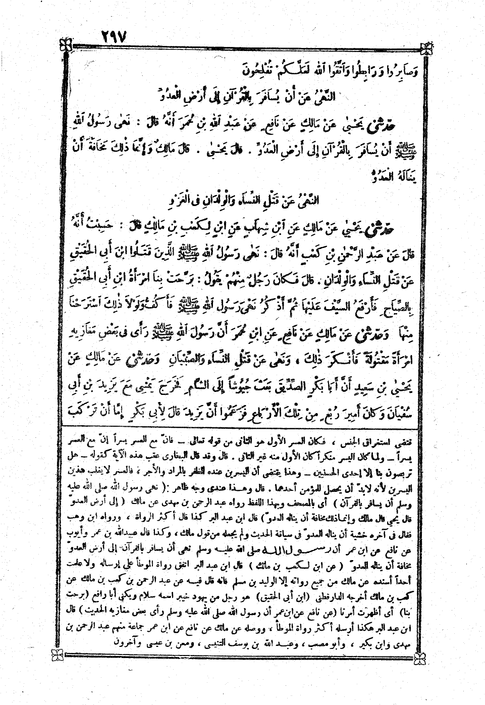 [962] نهى رَسُول الله صلى الله عَلَيْهِ وَسلم أَن يُسَافر بِالْقُرْآنِ أَي بالمصحف وَبِهَذَا اللَّفْظ رَوَاهُ عبد الرَّحْمَن بن مهْدي عَن مَالك إِلَى أَرض الْعَدو قَالَ يحيى قَالَ مَالك وَإِنَّمَا ذَلِك مَخَافَة أَن يَنَالهُ الْعَدو قَالَ بن عبد الْبر كَذَا قَالَ أَكثر الروَاة وَرَوَاهُ بن وهب فَقَالَ فِي آخِره خشيَة أَن يَنَالهُ الْعَدو فِي سِيَاقَة الحَدِيث وَلم يَجعله من قَول مَالك وَكَذَا قَالَ عبيد الله بن عمر وَأَيوب عَن نَافِع عَن بن عمر أَن رَسُول الله صلى الله عَلَيْهِ وَسلم نهى أَن يُسَافر بِالْقُرْآنِ إِلَى أَرض الْعَدو مَخَافَة أَن يَنَالهُ الْعَدو