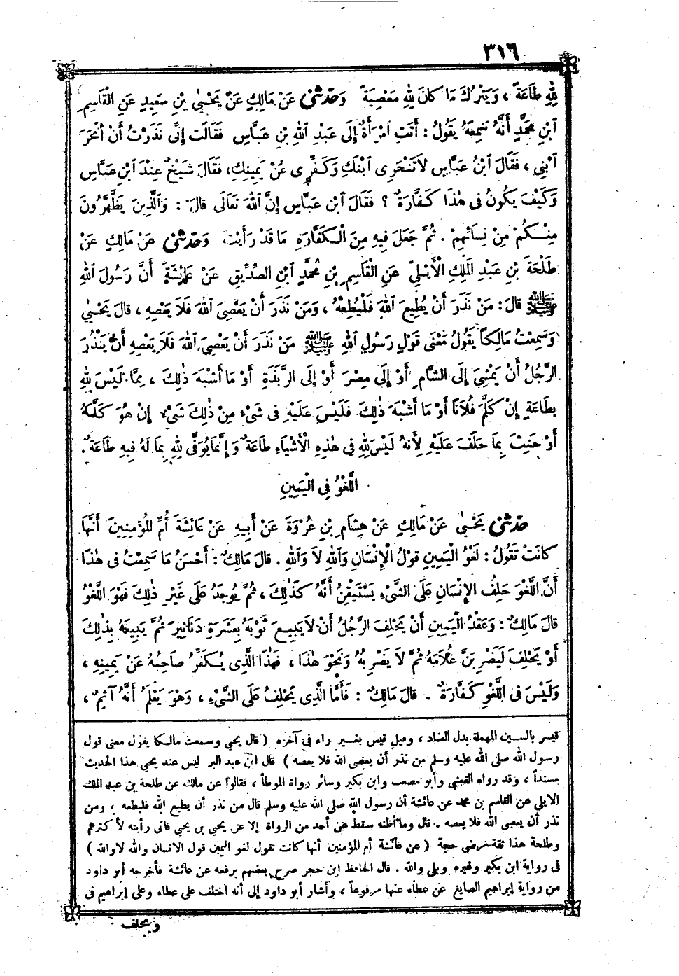 [1014] قَالَ يحيى وَسمعت مَالِكًا يَقُول معنى قَول رَسُول الله صلى الله عَلَيْهِ وَسلم من نذر أَن يَعْصِي الله فَلَا يَعْصِهِ قَالَ بن عبد الْبر لَيْسَ عِنْد يحيى هَذَا الحَدِيث مُسْندًا وَقد رَوَاهُ القعْنبِي وَأَبُو مُصعب وَابْن بكير وَسَائِر رُوَاة الْمُوَطَّأ فَقَالُوا عَن مَالك عَن طَلْحَة بن عبد الْملك الْأَيْلِي عَن الْقَاسِم بن مُحَمَّد عَن عَائِشَة أَن رَسُول الله صلى الله عَلَيْهِ وَسلم قَالَ من نذر أَن يُطِيع الله فليطعه وَمن نذر أَن يَعْصِي الله فَلَا يَعْصِهِ قَالَ وَمَا أَظُنهُ سقط عَن أحد من الروَاة إِلَّا عَن يحيى بن يحيى فَإِنِّي رَأَيْته لأكثرهم وَطَلْحَة هَذَا ثِقَة مرضِي حجَّة