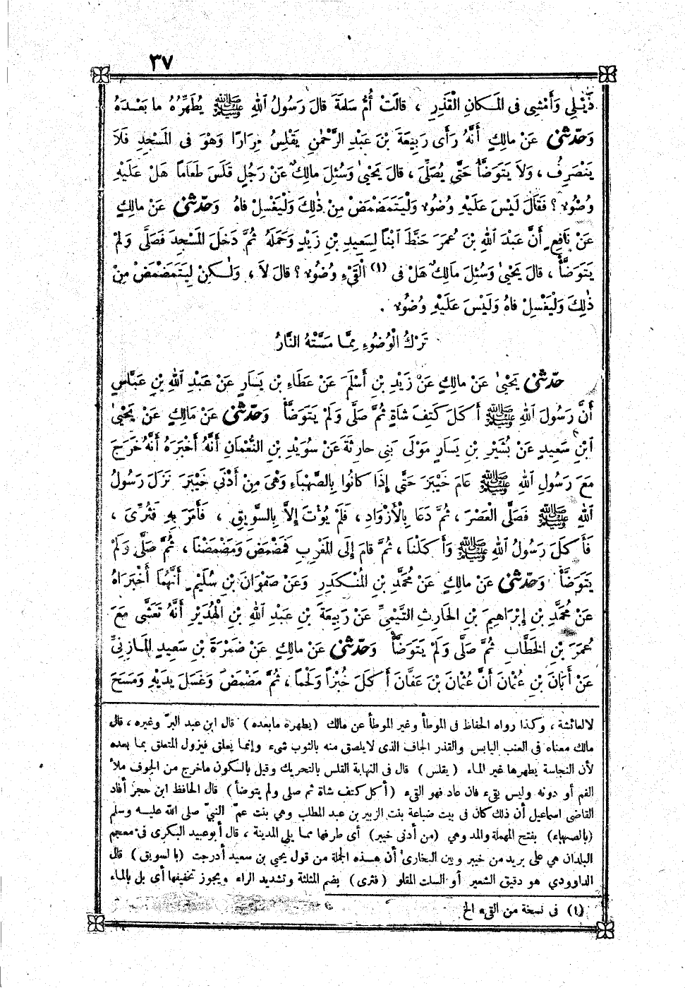 [45] عَن أم ولد لإِبْرَاهِيم بن عبد الرَّحْمَن بن عَوْف رَوَاهُ قُتَيْبَة عَن مَالك فَقَالَ عَن أم ولد لعبد الرَّحْمَن بن عَوْف وَمن طَرِيق أخرجه التِّرْمِذِيّ ثمَّ قَالَ وَرَوَاهُ عبد الله بن الْمُبَارك عَن مَالك فَقَالَ عَن أم ولد لعوف بن عبد الرَّحْمَن بن عَوْف قَالَ وَهُوَ وهم وَإِنَّمَا هُوَ لإِبْرَاهِيم وَهُوَ الصَّحِيح أَنَّهَا سَأَلت أم سَلمَة قَالَ بن عبد الْبر رَوَاهُ الْحُسَيْن بن الْوَلِيد عَن مَالك فَأَخْطَأَ فِيهِ فَإِنَّهُ قَالَ فِيهِ عَن مُحَمَّد بن إِبْرَاهِيم بن الْحَارِث عَن حميدة أَنَّهَا سَأَلت عَائِشَة وَهَذَا خطأ وَإِنَّمَا هُوَ لأم سَلمَة لَا لعَائِشَة وَكَذَا رَوَاهُ الْحفاظ فِي الْمُوَطَّأ وَغير الْمُوَطَّأ عَن مَالك يطهره مَا بعده قَالَ بن عبد الْبر وَغَيره قَالَ مَالك مَعْنَاهُ فِي الْعِنَب الْيَابِس والقذر الجاف الَّذِي لَا يلصق مِنْهُ بِالثَّوْبِ شَيْء وَإِنَّمَا يعلق فيزول الْمُتَعَلّق بِمَا بعده لِأَن النَّجَاسَة يطهرها غير المَاء