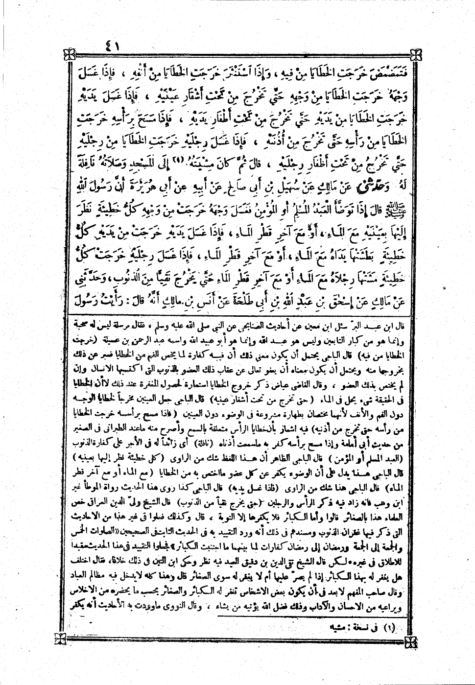 [60] عَن عبد الله الصنَابحِي قَالَ بن عبد الْبر سُئِلَ بن معِين عَن أَحَادِيث الصنَابحِي عَن النَّبِي صلى الله عَلَيْهِ وَسلم فَقَالَ مُرْسلَة لَيْسَ لَهُ صُحْبَة وَإِنَّمَا هُوَ من كبار التَّابِعين وَلَيْسَ هُوَ عبد الله وَإِنَّمَا هُوَ أَبُو عبيد الله واسْمه عبد الرَّحْمَن بن عسيلة خرجت الْخَطَايَا من فِيهِ قَالَ الْبَاجِيّ يحْتَمل أَن يكون معنى ذَلِك أَن فِيهِ كَفَّارَة لما يخص الْفَم من الْخَطَايَا فَعبر عَن ذَلِك بخروجها مِنْهُ وَيحْتَمل أَن يكون مَعْنَاهُ أَن يعفوا تَعَالَى عَن عِقَاب ذَلِك الْعُضْو بِالذنُوبِ الَّتِي اكتسبها الْإِنْسَان وَإِن لم يخْتَص بذلك الْعُضْو وَقَالَ القَاضِي عِيَاض ذكر خُرُوج الْخَطَايَا اسْتِعَارَة لحُصُول الْمَغْفِرَة عِنْد ذَلِك لاأن الْخَطَايَا فِي الْحَقِيقَة شَيْء يحل فِي المَاء حَتَّى تخرج من تَحت أشفار عَيْنَيْهِ قَالَ الْبَاجِيّ جعل الْعَينَيْنِ مخرجا لخطايا الْوَجْه دون الْفَم وَالْأنف لِأَنَّهُمَا مختصان بِطَهَارَة مَشْرُوعَة فِي الْوضُوء دون الْعَينَيْنِ فَإِذا مسح بِرَأْسِهِ خرجت الْخَطَايَا من رَأسه حَتَّى تخرج من أُذُنَيْهِ فِيهِ إِشْعَار بِأَن خَطَايَا الرَّأْس مُتَعَلقَة بِالسَّمْعِ وأصرح مِنْهُ مَا عِنْد الطَّبَرَانِيّ فِي الصَّغِير من حَدِيث أبي أُمَامَة وَإِذا مسح بِرَأْسِهِ كفر بِهِ مَا سَمِعت أذنَاهُ نَافِلَة أَي زَائِدا لَهُ فِي الْأجر على كَفَّارَة الذُّنُوب