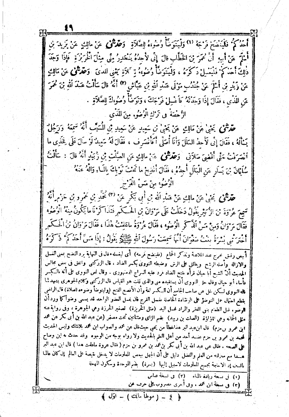 [84] عَن سُلَيْمَان بن يسَار عَن الْمِقْدَاد بن الْأسود أَن عَليّ بن أبي طَالب قَالَ بن عبد الْبر هَذَا إِسْنَاد لَيْسَ بِمُتَّصِل لِأَن سُلَيْمَان بن يسَار لم يسمع من الْمِقْدَاد وَلَا من عَليّ وَلم ير وَاحِدًا مِنْهُمَا فَإِنَّهُ ولد سنة أَربع وَثَلَاثِينَ وَلَا خلاف أَن الْمِقْدَاد توفّي سنة ثَلَاث وَثَلَاثِينَ قَالَ وَبَين سُلَيْمَان وَعلي فِي هَذَا الحَدِيث بن عَبَّاس أخرجه مُسلم وَالنَّسَائِيّ من طَرِيق بن وهب عَن مخرمَة بن بكير عَن أَبِيه عَن سُلَيْمَان بن يسَار عَن بن عَبَّاس قَالَ قَالَ عَليّ بن أبي طَالب أرْسلت الْمِقْدَاد بن الْأسود الحَدِيث الْمَذْي فِي لُغَتَانِ أفصحهما فتح الْمِيم وَسُكُون الذَّال الْمُعْجَمَة وَتَخْفِيف الْيَاء وَالْأُخْرَى كسر الذَّال وَتَشْديد الْيَاء وَهُوَ مَاء أَبيض رَقِيق يخرج عِنْد الملاعبة وتذكر الْجِمَاع فلينضح فرجه أَي ليغسله قَالَ فِي النِّهَايَة يرد النَّضْح بِمَعْنى الْغسْل والازالة وَأَصله الرشح وَيُطلق على الرش وَضَبطه النَّوَوِيّ بِكَسْر الضَّاد قَالَ الزَّرْكَشِيّ وَاتفقَ فِي بعض مجَالِس الحَدِيث أَن الشَّيْخ أَبَا حَيَّان قَرَأَهُ بِفَتْح الضَّاد فَرد عَلَيْهِ السراج الدمنهوري وَقَالَ نَص النَّوَوِيّ على أَنه بِالْكَسْرِ فأساء أَبُو حَيَّان وَقَالَ حق النَّوَوِيّ أَن يستفيده مني وَالَّذِي نلْت هُوَ الْقيَاس قَالَ الزَّرْكَشِيّ وَكَلَام الْجَوْهَرِي يشْهد لما قَالَه النَّوَوِيّ لَكِن نقل عَن صَاحب الْجَامِع أَن الْكسر لُغَة وَإِن الْأَفْصَح الْفَتْح وليتوضأ وضوءه للصَّلَاة قَالَ الرَّافِعِيّ بِقطع احْتِمَال حمل التَّوَضُّؤ على الْوَضَاءَة الْحَاصِلَة بِغسْل الْفرج فَإِن غسل الْعُضْو الْوَاحِد قد يُسمى وضوا كَمَا ورد أَن الْوضُوء قبل الطَّعَام يَنْفِي الْفقر وَالْمرَاد غسل ليد