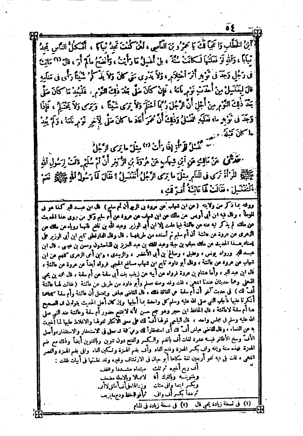 [112] فَقَالَ لقد ابْتليت بالاحتلام مُنْذُ وليت أَمر النَّاس قَالَ الْبَاجِيّ يحْتَمل أَن يُرِيد أَن شغله بِأَمْر النَّاس واهتمامه بهم صرفه عَن الِاشْتِغَال بِالنسَاء فَكثر عَلَيْهِ الِاحْتِلَام وَيحْتَمل أَن يُرِيد أَن ذَلِك كَانَ وقتا لابتلائه بِهِ لِمَعْنى من الْمعَانِي لم يذكرهُ وَوَقته بِمَا ذكر من ولَايَته