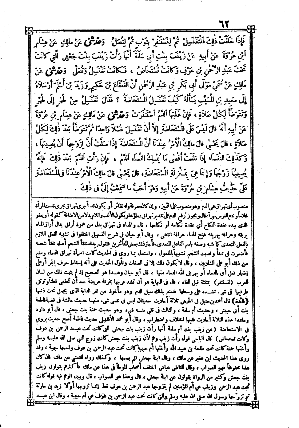 [136] عَن نَافِع عَن سُلَيْمَان بن يسَار عَن أم سَلمَة قَالَ بن عبد الْبر كَذَا رَوَاهُ مَالك وَأَيوب وَرَوَاهُ اللَّيْث بن سعد وصخر بن جوَيْرِية وَعبد الله بن عمر عَن نَافِع عَن سُلَيْمَان بن يسَار أَن رجلا أخبرهُ عَن أم سَلمَة فادخلوا بَين سُلَيْمَان وَبَين أم سَلمَة رجلا أَن امْرَأَة قَالَ الْبَاجِيّ يُقَال هِيَ فَاطِمَة بنت أبي حُبَيْش قَالَ وَقد بَين ذَلِك حَمَّاد بن زيد وسُفْيَان بن عُيَيْنَة فِي حَدِيثهمَا عَن أَيُّوب عَن سُلَيْمَان بن يسَار قلت وَكَذَا هُوَ مُبين فِي سنَن أبي دَاوُد من طَرِيق وهيب عَن أَيُّوب كَانَت تهراق الدِّمَاء قَالَ الْبَاجِيّ يُرِيد أَنَّهَا من كَثْرَة الدَّم بهَا كَانَت تهريقه وَفِي النِّهَايَة كَذَا جَاءَ هَذَا الحَدِيث تهراق الدَّم على مَا لم يسم فَاعله وَالدَّم مَنْصُوب أَي تهراق هِيَ الدَّم وَهُوَ مَنْصُوب على التَّمْيِيز وَإِن كَانَ معرفَة وَله نَظَائِر أَو يكون قد أجْرى تهراق مجْرى نفست الْمَرْأَة غُلَاما ونتج الْفرس مهْرا قَالَ وَيجوز رفع الدَّم على تَقْدِير تهراق دماؤها وَيكون اللف وَاللَّام بَدَلا من الْإِضَافَة كَقَوْلِه أَوْ يَعْفُوَ الَّذِي بِيَدِهِ عُقْدَةُ النِّكَاحِ أَي عقدَة نِكَاحه أَو نِكَاحهَا قَالَ وَالْهَاء تهراق بدل من همزَة أراق يُقَال أراق المَاء يريقه وهراقه يهريقه بِفَتْح الْهَاء هراقة انْتهى وَقَالَ أَبُو حَيَّان فِي شرح التسهيل اخْتلفُوا فِي تَشْبِيه الْفِعْل اللَّازِم بِالْفِعْلِ الْمُتَعَدِّي كَمَا شبه وَصفه باسم الْفَاعِل الْمُتَعَدِّي فَأجَاز ذَلِك بعض الْمُتَأَخِّرين فَتَقول زيد قد تفقأ الشَّحْم أَصله تفقأ شحمه فأضمرت فِي تفقأ ونصبت الشَّحْم تَشْبِيها بالمفعول وَاسْتدلَّ بِمَا رُوِيَ فِي الحَدِيث كَانَت امْرَأَة تهراق الدِّمَاء وَمنع من ذَلِك أَبُو عَليّ الشلويين وَقَالَ لَا يكون ذَلِك إِلَّا فِي الصِّفَات وَتَأَول الحَدِيث على أَنه إِسْقَاط حرف الْجَرّ أَو على إِضْمَار فعل أَي بالدماء أَو يهريق الله الدِّمَاء مِنْهَا قَالَ أَبُو حَيَّان وَهَذَا هُوَ الصَّحِيح إِذْ لم يثبت ذَلِك من لِسَان الْعَرَب لتستثفر بمثلثة قبل الْفَاء قَالَ فِي النِّهَايَة هُوَ أَن تشد فرجهَا بِخرقَة عريضة بعد أَن تحتشي قطنا وتوثق طرفيها فِي شَيْء تشده على وَسطهَا فتمنع بذلك سيل الدَّم وَهُوَ مَأْخُوذ من ثفر الدَّابَّة الَّذِي يَجْعَل تَحت ذنبها فَائِدَة قَالَ أَحْمد بن حَنْبَل فِي الْحيض ثَلَاثَة أَحَادِيث حديثان لَيْسَ فِي نَفسِي شَيْء مِنْهُمَا حَدِيث عَائِشَة فِي قَضِيَّة فَاطِمَة بنت أبي حُبَيْش وَحَدِيث أم سَلمَة وَالثَّالِث فِي قلبِي مِنْهُ شَيْء وَهُوَ حَدِيث حمْنَة بنت جحش قَالَ أَبُو دَاوُد وَمَا عدا هَذِه الثَّلَاثَة أَحَادِيث فَفِيهَا اخْتِلَاف واضطراب وَقَالَ أَبُو مُحَمَّد الأشبيلي حَدِيث فَاطِمَة أصح حَدِيث يرْوى فِي الِاسْتِحَاضَة
