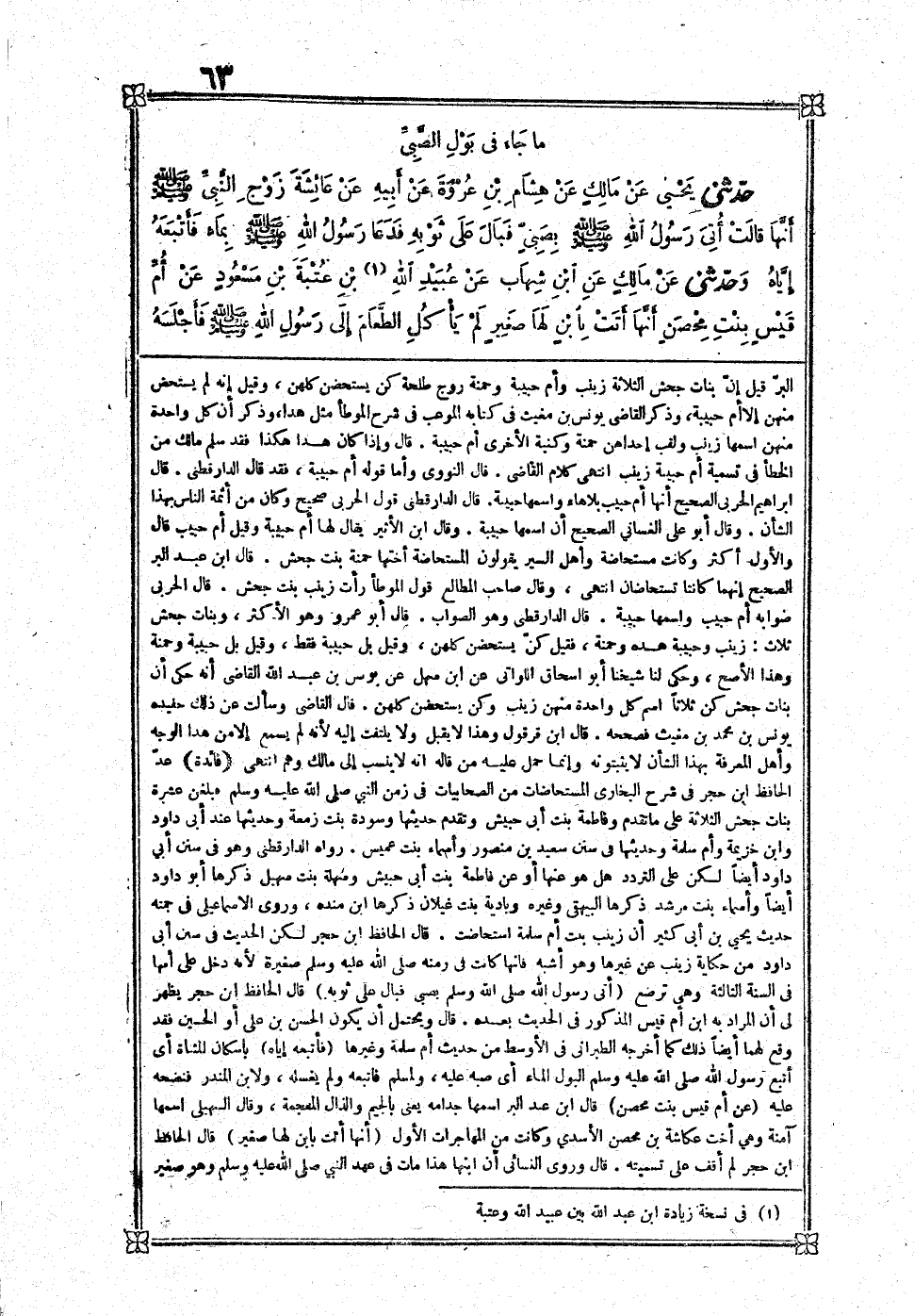 [137] عَن زَيْنَب بنت أم سَلمَة أَنَّهَا رَأَتْ زَيْنَب بنت جحش الَّتِي كَانَت تَحت عبد الرَّحْمَن بن عَوْف وَكَانَت تستحاض قَالَ الْبَاجِيّ قَول رَأَتْ زَيْنَب وهم لِأَن زَيْنَب بنت جحش كَانَت زوج النَّبِي صلى الله عَلَيْهِ وَسلم وَأُخْتهَا حمْنَة كَانَت تَحت طَلْحَة بن عبيد الله وَأُخْتهَا أم حَبِيبَة كَانَت تَحت عبد الرَّحْمَن بن عَوْف وَاسْمهَا جهبة وَقد روى هَذَا الحَدِيث بن عفير عَن مَالك وَقَالَ ابْنة جحش فَلم يسمهَا وَكَذَلِكَ رَوَاهُ القعْنبِي عَن مَالك فَإِن كَانَ هَذَا مَحْفُوظًا فَهُوَ الصَّوَاب وَقَالَ القَاضِي عِيَاض اخْتلف أَصْحَاب الْمُوَطَّأ فِي هَذَا عَن مَالك فأكثرهم يَقُولُونَ زَيْنَب بنت جحش وَكثير من الروَاة يَقُولُونَ عَن ابْنة جحش قَالَ وَهَذَا هُوَ الصَّوَاب قَالَ وَيبين الْوَهم فِيهِ بقوله كَانَت تَحت عبد الرَّحْمَن وَزَيْنَب هِيَ أم الْمُؤمنِينَ لم يَتَزَوَّجهَا عبد الرَّحْمَن بن عَوْف قطّ إِنَّمَا تزَوجهَا أَولا زيد بن حَارِثَة ثمَّ تزَوجهَا رَسُول الله صلى الله عَلَيْهِ وَسلم وَالَّتِي كَانَت تَحت عبد الرَّحْمَن بن عَوْف هِيَ أم حَبِيبَة وَقَالَ بن عبد الْبر قيل إِن بَنَات جحش الثَّلَاثَة زَيْنَب وَأم حَبِيبَة وَحمْنَة زوج طَلْحَة كن يستحضن كُلهنَّ وَقيل إِنَّه لم يستحض مِنْهُنَّ إِلَّا أم حَبِيبَة وَذكر القَاضِي يُونُس بن مغيث فِي كِتَابه الموعب فِي شرح الْمُوَطَّأ مث لهَذَا وَذكر أَن كل وَاحِدَة مِنْهُنَّ اسْمهَا زَيْنَب ولقب إِحْدَاهُنَّ حمْنَة وكنبة الْأُخْرَى أم حَبِيبَة قَالَ وَإِذا كَانَ هَذَا هَكَذَا فقد سلم مَالك من الْخَطَأ فِي تَسْمِيَة أم حَبِيبَة زَيْنَب انْتهى كَلَام القَاضِي قَالَ النَّوَوِيّ وَأما قَوْله أم حَبِيبَة فقد قَالَ الدَّارَقُطْنِيّ قَالَ إِبْرَاهِيم الْحَرْبِيّ الصَّحِيح أَنَّهَا أم حبيب بِلَا هَاء وَاسْمهَا حَبِيبَة قَالَ الدَّارَقُطْنِيّ قَول الْحَرْبِيّ صَحِيح وَكَانَ من أَئِمَّة النَّاس بِهَذَا الشَّأْن وَقَالَ أَبُو عَليّ الغساني الصَّحِيح أَن اسْمهَا حَبِيبَة وَقَالَ بن الْأَثِير يُقَال لَهَا أم حَبِيبَة وَقيل أم حبيب قَالَ وَالْأول أَكثر وَكَانَت مُسْتَحَاضَة وَأهل السّير يَقُولُونَ الْمُسْتَحَاضَة أُخْتهَا حمْنَة بنت جحش قَالَ بن عبد الْبر الصَّحِيح إنَّهُمَا كَانَتَا تستحاضان انْتهى وَقَالَ صَاحب الْمطَالع قَول الْمُوَطَّأ رَأَتْ زَيْنَب بنت جحش قَالَ الْحَرْبِيّ صَوَابه أم حبيب وَاسْمهَا حَبِيبَة قَالَ الدَّارَقُطْنِيّ وَهُوَ الصَّوَاب قَالَ أَبُو عَمْرو وَهُوَ الْأَكْثَر وَبَنَات جحش ثَلَاث زَيْنَب وحبيبة هَذِه وَحمْنَة فَقيل كن يستحضن كُلهنَّ وَقيل بل حَبِيبَة فَقَط وَقيل بل حَبِيبَة وَحمْنَة وَهَذَا الْأَصَح وَحكى لنا شَيخنَا أَبُو إِسْحَاق اللواتي عَن بن سهل عَن يُونُس بن عبد الله القَاضِي أَنه حكى إِن بَنَات جحش كن ثَلَاثًا اسْم كل وَاحِدَة مِنْهُنَّ زَيْنَب وَكن يستحضن كُلهنَّ قَالَ القَاضِي وَسَأَلت عَن ذَلِك حفيده يُونُس بن مُحَمَّد بن مغيث فصححه قَالَ بن قرقول وَهَذَا لَا يقبل وَلَا يلْتَفت إِلَيْهِ لِأَنَّهُ لم يسمع إِلَّا من هَذَا الْوَجْه وَأهل الْمعرفَة بِهَذَا الشَّأْن لَا يثبتونه وَإِنَّمَا حمل عَلَيْهِ من قَالَه إِنَّه لَا ينْسب إِلَى مَالك وهم انْتهى فَائِدَة عد الْحَافِظ بن حجر فِي شرح البُخَارِيّ المستحاضات من الصحابيات فِي زمن النَّبِي صلى الله عَلَيْهِ وَسلم فبلغن عشرَة بَنَات جحش الثَّلَاثَة على مَا تقدم وَفَاطِمَة بنت أبي حُبَيْش وَتقدم حَدِيثهَا وَسَوْدَة بنت زَمعَة وحديثها عِنْد أبي دَاوُد وَابْن خُزَيْمَة وَأم سَلمَة وحديثها فِي سنَن سعيد بن مَنْصُور وَأَسْمَاء بنت عُمَيْس رَوَاهُ الدَّارَقُطْنِيّ وَهُوَ فِي سنَن أبي دَاوُد أَيْضا لَكِن على التَّرَدُّد هَل هُوَ عَنَّا أَو عَن فَاطِمَة بنت أبي حُب