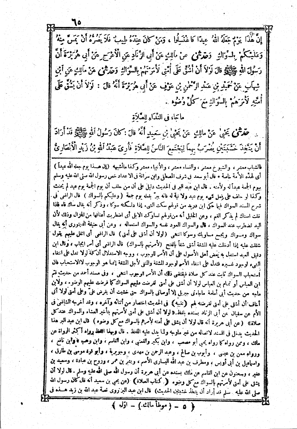 [146] عَن أبي هُرَيْرَة أَنه قَالَ لَوْلَا أَن يشق على أمته لأمرهم بِالسِّوَاكِ مَعَ كل وضوء قَالَ بن عبد الْبر هَذَا الحَدِيث يدْخل فِي الْمسند لاتصاله من غير مَا وَجه وَلما يدل عَلَيْهِ اللَّفْظ قَالَ وَبِهَذَا اللَّفْظ رَوَاهُ أَكثر الروَاة عَن مَالك وَمِمَّنْ رَوَاهُ كَمَا رَوَاهُ يحيى أَبُو مُصعب وَابْن بكير والقعنبي وَابْن الْقَاسِم وَابْن وهب وَابْن نَافِع وَرَوَاهُ معن بن عِيسَى وَأَيوب بن صَالح وَعبد الرَّحْمَن بن مهْدي وَجُوَيْرِية وَأَبُو قُرَّة مُوسَى بن طَارق وَإِسْمَاعِيل بن أبي أويس ومطرف بن عبد الله اليساري ألأصم وَبشر بن عمر وروح بن عبَادَة وَسَعِيد بن عفير وَسَحْنُون عَن بن الْقَاسِم عَن مَالك بِسَنَدِهِ عَن أبي هُرَيْرَة أَن رَسُول الله صلى الله عَلَيْهِ وَسلم قَالَ لَوْلَا أَن يشق على أمتِي لأمرتهم بِالسِّوَاكِ مَعَ كل وضوء