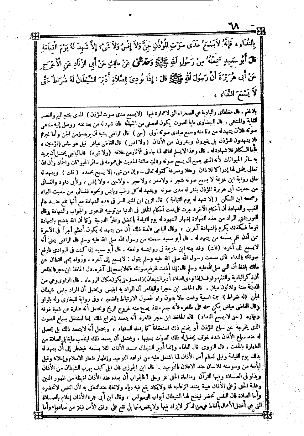 [151] فَإِذا كنت فِي غنمك أَو باديتك قَالَ الرَّافِعِيّ يحْتَمل أَن يكون شكا من الرَّاوِي وَيحْتَمل أَن يُرِيد فِي غنمك أَو فِي باديتك بَعيدا عَن الْغنم أَو بِلَا غنم قَالَ مغلطاي والبادية هِيَ الصَّحرَاء لاتي لَا عمَارَة فِيهَا لَا يسمع مدى صَوت الْمُؤَذّن المدى بِفَتْح الْمِيم وَالْقصر الْغَايَة والمنتهى قَالَ الْبَيْضَاوِيّ غَايَة الصَّوْت يكون للمصغي من انتهائه فَإِذا شهد لَهُ من بعد عَنهُ وَوصل إِلَيْهِ مُنْتَهى صَوته فَلِأَن يشْهد لَهُ من دنا مِنْهُ وَسمع مبادي صَوته أولى جن قَالَ الرَّافِعِيّ يشبه أَن يُرِيد مُؤمن الْجِنّ وَأما غَيرهم فَلَا يشْهدُونَ للمؤذن بل يغيرون وينفرون من الْأَذَان وَلَا أنس قَالَ القَاضِي عِيَاض قيل هُوَ خَاص بِالْمُؤْمِنِينَ فَأَما الْكفْر فَلَا شَهَادَة لَهُ قَالَ وَهَذَا لَا يسلم لقائله لما جَاءَ فِي الْآثَار من خِلَافه وَلَا شَيْء قَالَ الْبَاجِيّ يحْتَمل أَن يُرِيد بِهِ سَائِر الْحَيَوَانَات لِأَنَّهُ الَّذِي يَصح أَن يسمع صَوته وَقَالَت طَائِفَة الحَدِيث على عُمُومه فِي سَائِر الْحَيَوَانَات والجماد وَإِن الله تَعَالَى يخلق لَهَا إدراكا للاذان وعقلا وَمَعْرِفَة كَقَوْلِه تَعَالَى وَإِن من شَيْء إِلَّا يُسَبِّحُ بِحَمْدِهِ قلت وَيشْهد لَهُ مَا فِي رِوَايَة بن خُزَيْمَة لَا يسمع صَوته شجر وَلَا مدر وَلَا حجر وَلَا جن وَلَا إنس وَلأبي دَاوُد وَالنَّسَائِيّ من حَدِيث أبي هُرَيْرَة الْمُؤَذّن يغْفر لَهُ مدى صَوته وَيشْهد لَهُ كل رطب ويابس وَنَحْوه للنسائي من حَدِيث الْبَراء وَصَححهُ بن السكن إِلَّا شهد لَهُ يَوْم الْقِيَامَة قَالَ الزين بن الْمُنِير السِّرّ فِي هَذِه الشَّهَادَة مَعَ أَنَّهَا تقع عِنْد عَالم الْغَيْب وَالشَّهَادَة أَن أَحْكَام الْآخِرَة جرت على نعت أَحْكَام الْخلق فِي الدُّنْيَا من تَوْجِيه الدَّعْوَى وَالْجَوَاب وَالشَّهَادَة وَقَالَ التوربشتي المُرَاد من هَذِه الشَّهَادَة إشهار الْمَشْهُود لَهُ يَوْم الْقِيَامَة بِالْفَضْلِ وعلو الدرجَة وكما أَن الله يفضح بِالشَّهَادَةِ قوما فَكَذَلِك يكرم بِالشَّهَادَةِ آخَرين وَقَالَ الْبَاجِيّ فَائِدَة ذَلِك أَن من يشْهد لَهُ يكون أعظم أجرا فِي الْآخِرَة مِمَّن أذن فَلم يسمعهُ من يشْهد لَهُ قَالَ أَبُو سعيد سمعته من رَسُول الله صلى الله عَلَيْهِ وَسلم قَالَ الرَّافِعِيّ يَعْنِي أَنه لَا يسمع إِلَى آخِره قلت وَقد بَينه بن خُزَيْمَة فِي رِوَايَته وَلَفظه قَالَ أَبُو سعيد إِذا كنت فِي الْبَوَادِي فارفع صَوْتك بالنداء فَانِي سَمِعت رَسُول الله صلى الله عَلَيْهِ وَسلم يَقُول لَا يسمع إِلَى آخِره وَرَوَاهُ يحيى الْقطَّان عَن مَالك بِلَفْظ أَن النَّبِي صلى الله عَلَيْهِ وَسلم قَالَ إِذا أَذِنت فارفع صَوْتك فَإِنَّهُ لَا يسمع إِلَى آخِره قَالَ الْحَافِظ بن حجر فَالظَّاهِر أَن ذكر الْبَادِيَة وَالْغنم وقُوف