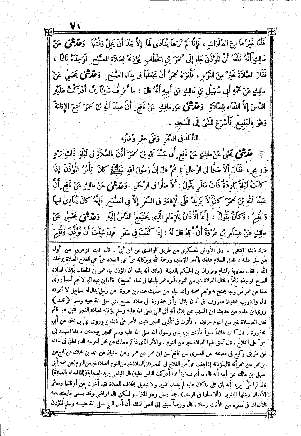 [154] مَالك أَنه بلغه أَن الْمُؤَذّن جَاءَ عمر بن الْخطاب يُؤذنهُ لصَلَاة الصُّبْح فَوَجَدَهُ نَائِما فَقَالَ الصَّلَاة خير من النّوم فَأمره عمر فَجَعلهَا فِي نِدَاء الصُّبْح قَالَ بن عبد الْبر لَا أعلم أحدا روى هَذَا عَن عمر من وَجه يحْتَج بِهِ وَتعلم صِحَّته وَإِنَّمَا جَاءَ من حَدِيث هِشَام بن عُرْوَة عَن رجل يُقَال لَهُ إِسْمَاعِيل لَا أعرفهُ قَالَ والتثويب مَحْفُوظ مَعْرُوف فِي أَذَان بِلَال وَأبي مَحْذُورَة فِي صَلَاة الصُّبْح للنَّبِي صلى الله عَلَيْهِ وَسلم قلت روى بن ماجة من حَدِيث بن الْمسيب عَن بِلَال أَنه أَتَى النَّبِي صلى الله عَلَيْهِ وَسلم يُؤذنهُ لصَلَاة الْفجْر فَقيل هُوَ نَائِم فَقَالَ الصَّلَاة خير من النّوم مرَّتَيْنِ فأقرت فِي تأذين الْفجْر فَثَبت الْأَمر على ذَلِك وروى بَقِي بن مخلد عَن أبي مَحْذُورَة قَالَ كنت غُلَاما صَبيا فَأَذنت بَين يَدي رَسُول الله صلى الله عَلَيْهِ وَسلم الْفجْر يَوْم حنين فَلَمَّا انْتَهَيْت إِلَى حَيّ على الْفَلاح قَالَ ألحق فِيهَا الصَّلَاة خير من النّوم والأثر الَّذِي ذكره مَالك عَن عمر أخرجه الدَّارَقُطْنِيّ فِي سنَنه من طَرِيق وَكِيع فِي مُصَنفه عَن الْعمريّ عَن نَافِع عَن بن عمر عَن عمر وَعَن سُفْيَان عَن مُحَمَّد بن عجلَان عَن نَافِع عَن بن عمر عَن عمر أَنه قَالَ لمؤذنه إِذا بلغت حَيّ على الْفَلاح فِي الْفجْر فَقل الصَّلَاة خير من النّوم الصَّلَاة خير من النّوم