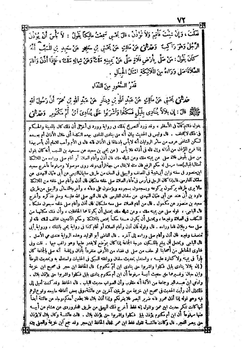 [160] عَن يحيى بن سعيد عَن سعيد بن الْمسيب أَنه كَانَ يَقُول من صلى بِأَرْض فلاة صلى عَن يَمِينه ملك وَعَن شِمَاله ملك فَإِن أذن وَأقَام الصَّلَاة أَو أَقَامَ صلى وَرَاءه من الْمَلَائِكَة أَمْثَال الْجبَال هَذَا مُرْسل لَهُ حكم الرّفْع فَإِن مثله لَا يُقَال من جِهَة الرَّأْي وَقد رُوِيَ مَوْصُولا وَمَرْفُوعًا فَأخْرج سعيد بن مَنْصُور فِي سنَنه وَابْن أبي شيبَة فِي المُصَنّف وَالْبَيْهَقِيّ فِي السّنَن من طَرِيق سُلَيْمَان التَّيْمِيّ عَن أبي عُثْمَان النَّهْدِيّ عَن سلمَان الْفَارِسِي قَالَ إِذا كَانَ الرجل فِي أَرض فِي فَأَقَامَ الصَّلَاة خَلفه ملكان فَإِن أذن وَأقَام صلى خَلفه من الْمَلَائِكَة مَالا يرى طرفاه يَرْكَعُونَ بركوعه ويسجدون بسجوده ويؤمنون على دُعَائِهِ وَأخرجه النَّسَائِيّ وَالْبَيْهَقِيّ من طَرِيق دَاوُد بن أبي هِنْد عَن أبي عُثْمَان النَّهْدِيّ عَن سلمَان الْفَارِسِي قَالَ قَالَ رَسُول الله صلى الله عَلَيْهِ وَسلم فَذكره وَأخرج سعيد بن مَنْصُور عَن مَكْحُول قَالَ من أَقَامَ الصَّلَاة صلى مَعَه ملكان فَإِن أذن وَأقَام صلى خَلفه سَبْعُونَ ملكا قَالَ الْبَاجِيّ قَوْله صلى عَن يَمِينه ملك وَعَن شِمَاله ملك يحْتَمل أَن يَكُونَا هما الحافظين وَإِن ذَلِك مكانهما من الْمُكَلف فِي الصَّلَاة وَغَيرهَا وَيحْتَمل أَن يكون هَذَا حكما يخْتَص بِالْمَلَائِكَةِ وَحكم الْآدَمِيّين مُخَالف لذَلِك فَإِنَّهُ لَو صلى مَعَه رجلَانِ قاما وَرَاءه قَالَ وَقَوله فَإِن أذن وَأقَام الصَّلَاة أَو أَقَامَ كَذَا فِي رِوَايَة يحيى بِالشَّكِّ وَرِوَايَة أبي منصف وَغَيره فَإِن أذن وَأقَام صلى وَرَاءه إِلَى آخِره قَالَ القَاضِي أَبُو الْوَلِيد وَهَذِه الرِّوَايَة عِنْدِي هِيَ الأَصْل قَالَ الْبَاجِيّ وَيحْتَمل أَن يبلغ بالملكين دَرَجَة الْجَمَاعَة إِذا كَانَ بِموضع لَا يقدر عَلَيْهَا وَهُوَ رَاغِب فِيهَا قلت وَفِي فتاوي الحناطي من أَصْحَابنَا لَو حلف من صلى فِي فضاء من الأَرْض مُنْفَردا بِأَذَان وَإِقَامَة أَنه صلى بِالْجَمَاعَة كَانَ بارا فِي يَمِينه وَلَا كَفَّارَة عَلَيْهِ وَاسْتدلَّ بِحَدِيث سلمَان وَوَافَقَهُ السُّبْكِيّ فِي الحلبيات وَاسْتدلَّ بِهِ وَبِحَدِيث الْمُوَطَّأ