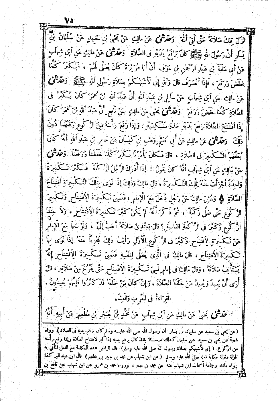 [164] عَن بن شهَاب عَن عَليّ بن حُسَيْن بن عَليّ بن أبي طَالب أَنه قَالَ كَانَ رَسُول الله صلى الله عَلَيْهِ وَسلم يكبر فِي الصَّلَاة كلما خفض وَرفع قَالَ بن عبد الْبر لَا أعلم خلافًا من رُوَاة الْمُوَطَّأ فِي إرْسَال هَذَا الحَدِيث وَرَوَاهُ عبد الْوَهَّاب بن عَطاء عَن مَالك عَن بن شهَاب عَن عَليّ بن حُسَيْن عَن أَبِيه مَوْصُولا وَرَوَاهُ عبد الرَّحْمَن بن خَالِد بن نجيح عَن أَبِيه عَن مَالك عَن بن شهَاب عَن عَليّ بن الْحُسَيْن عَن عَليّ بن أبي طَالب وَلَا يَصح فِيهِ إِلَّا مَا فِي الْمُوَطَّأ مُرْسل وَقد أَخطَأ فِيهِ أَيْضا مُحَمَّد بن مُصعب القرقساني فَرَوَاهُ عَن مَالك عَن الزُّهْرِيّ عَن سَالم عَن أَبِيه وَلَا يَصح فِيهِ هَذَا الْإِسْنَاد وَالصَّوَاب عِنْدهم مَا فِي الْمُوَطَّأ