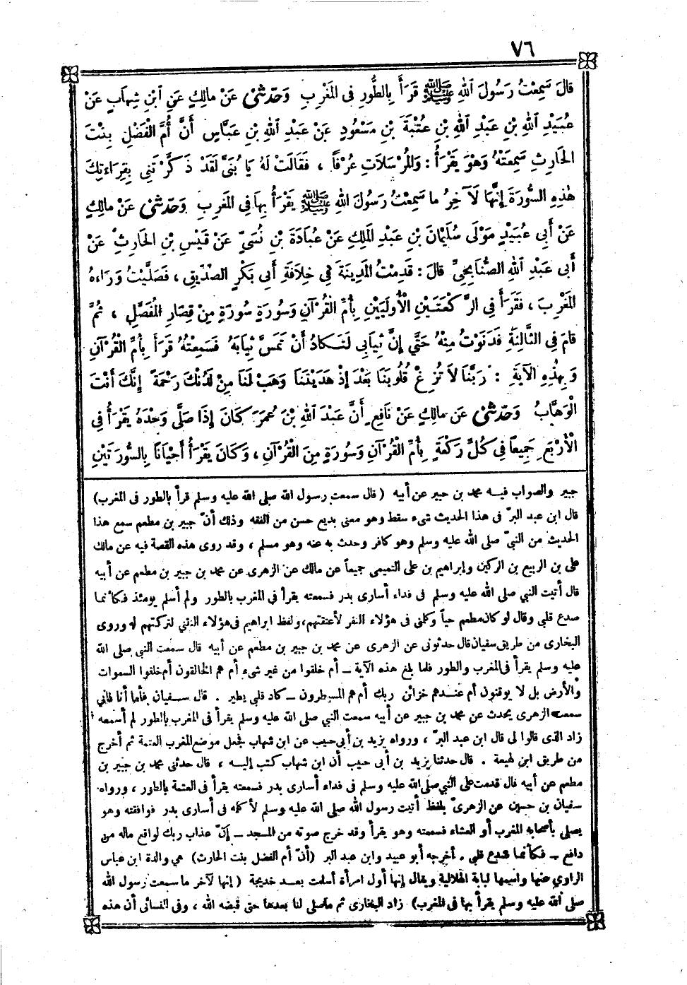 [171] عَن بن شهَاب عَن مُحَمَّد بن جُبَير بن مطعم قَالَ بن عبد الْبر كَذَا رَوَاهُ مَالك وَجَمَاعَة أَصْحَاب بن شهَاب عَنهُ عَن مُحَمَّد بن جُبَير وَرَوَاهُ مُحَمَّد بن عَمْرو عَن بن شهَاب عَن نَافِع بن جُبَير وَالصَّوَاب فِيهِ مُحَمَّد بن جُبَير عَن أَبِيه قَالَ سَمِعت رَسُول الله صلى الله عَلَيْهِ وَسلم قَرَأَ بِالطورِ فِي الْمغرب قَالَ بن عبد الْبر فِي هَذَا الحَدِيث شَيْء سقط وَهُوَ معنى بديع حسن من الْفِقْه وَذَلِكَ أَن جُبَير بن مطعم سمع هَذَا الحَدِيث من النَّبِي صلى الله عَلَيْهِ وَسلم وَهُوَ كَافِر وَحدث بِهِ عَنهُ وَهُوَ مُسلم وَقد روى هَذِه الْقِصَّة فِيهِ عَن مَالك عَليّ بن الرّبيع بن الركين وَإِبْرَاهِيم بن عَليّ التَّمِيمِي جَمِيعًا عَن مَالك عَن الزُّهْرِيّ عَن مُحَمَّد بن جُبَير بن مطعم عَن أَبِيه قَالَ أتيت النَّبِي صلى الله عَلَيْهِ وَسلم فِي فدَاء أُسَارَى بدر فَسَمعته يقْرَأ فِي الْمغرب بِالطورِ وَلم أسلم يَوْمئِذٍ فَكَأَنَّمَا صدع قلبِي وَقَالَ لَو كَانَ مطعم حَيا وكلمني فِي هَؤُلَاءِ النَّفر لأعتقتهم وَلَفظ إِبْرَاهِيم فِي هَؤُلَاءِ لتركتهم لَهُ وروى البُخَارِيّ من طَرِيق سُفْيَان قَالَ حَدثُونِي عَن الزُّهْرِيّ عَن مُحَمَّد بن جُبَير بن مطعم عَن أَبِيه قَالَ سَمِعت النَّبِي صلى الله عَلَيْهِ وَسلم يقْرَأ فِي الْمغرب وَالطور فَلَمَّا بلغ هَذِه الْآيَة أَمْ خُلِقُوا مِنْ غَيْرِ شَيْءٍ أَمْ هُمُ الْخَالِقُونَ أَمْ خَلَقُوا السَّمَاوَاتِ وَالْأَرْضَ بَلْ لَا يُوقِنُونَ أَمْ عِنْدَهُمْ خَزَائِنُ رَبِّكَ أَمْ هم المسيطرون كَاد قلبِي يطير قَالَ سُفْيَان فَأَما أَنا فَانِي سَمِعت الزُّهْرِيّ يحدث عَن مُحَمَّد بن جُبَير عَن أَبِيه سَمِعت النَّبِي صلى الله عَلَيْهِ وَسلم يقْرَأ فِي الْمغرب بِالطورِ لم أسمعهُ زَاد الَّذِي قَالُوا لي قَالَ اب عبد الْبر وَرَوَاهُ يزِيد بن أبي حبيب عَن بن شهَاب فَجعل مَوضِع الْمغرب الْعَتَمَة ثمَّ أخرج من طَرِيق بن لَهِيعَة قَالَ حَدثنَا يزِيد بن أبي حبيب أَن بن شهَاب كتب إِلَيْهِ قَالَ حَدثنِي مُحَمَّد بن جُبَير بن مطعم عَن أَبِيه قَالَ قدمت على النَّبِي صلى الله عَلَيْهِ وَسلم فِي فدَاء أُسَارَى بدر فَسَمعته يقْرَأ فِي الْعَتَمَة بِالطورِ وَرَوَاهُ سُفْيَان بن حُسَيْن عَن الزُّهْرِيّ بِلَفْظ أتيت رَسُول الله صلى الله عَلَيْهِ وَسلم لأكلمه فِي أُسَارَى بدر فوافقته وَهُوَ يُصَلِّي بِأَصْحَابِهِ الْمغرب أَو الْعشَاء فَسَمعته وَهُوَ يقْرَأ وَقد خرج صَوته من الْمَسْجِد إِنَّ عَذَابَ رَبِّكَ لَوَاقِعٌ مَاله مِنْ دَافِعٍ فَكَأَنَّمَا صدع قلبِي أخرجه أَبُو عبيد وَابْن عبد الْبر