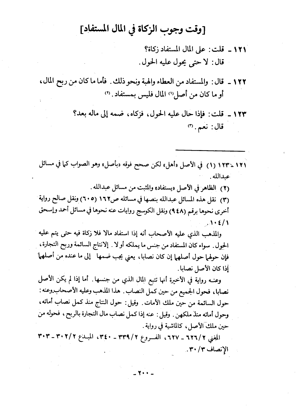 ١٢٢ - قَالَ والمستفاد من الْعَطاء وَالْهِبَة وَنَحْو ذَلِك فَأَما مَا كَانَ من ربح المَال أَو مَا كَانَ من أصل المَال فَلَيْسَ بمستفاد
