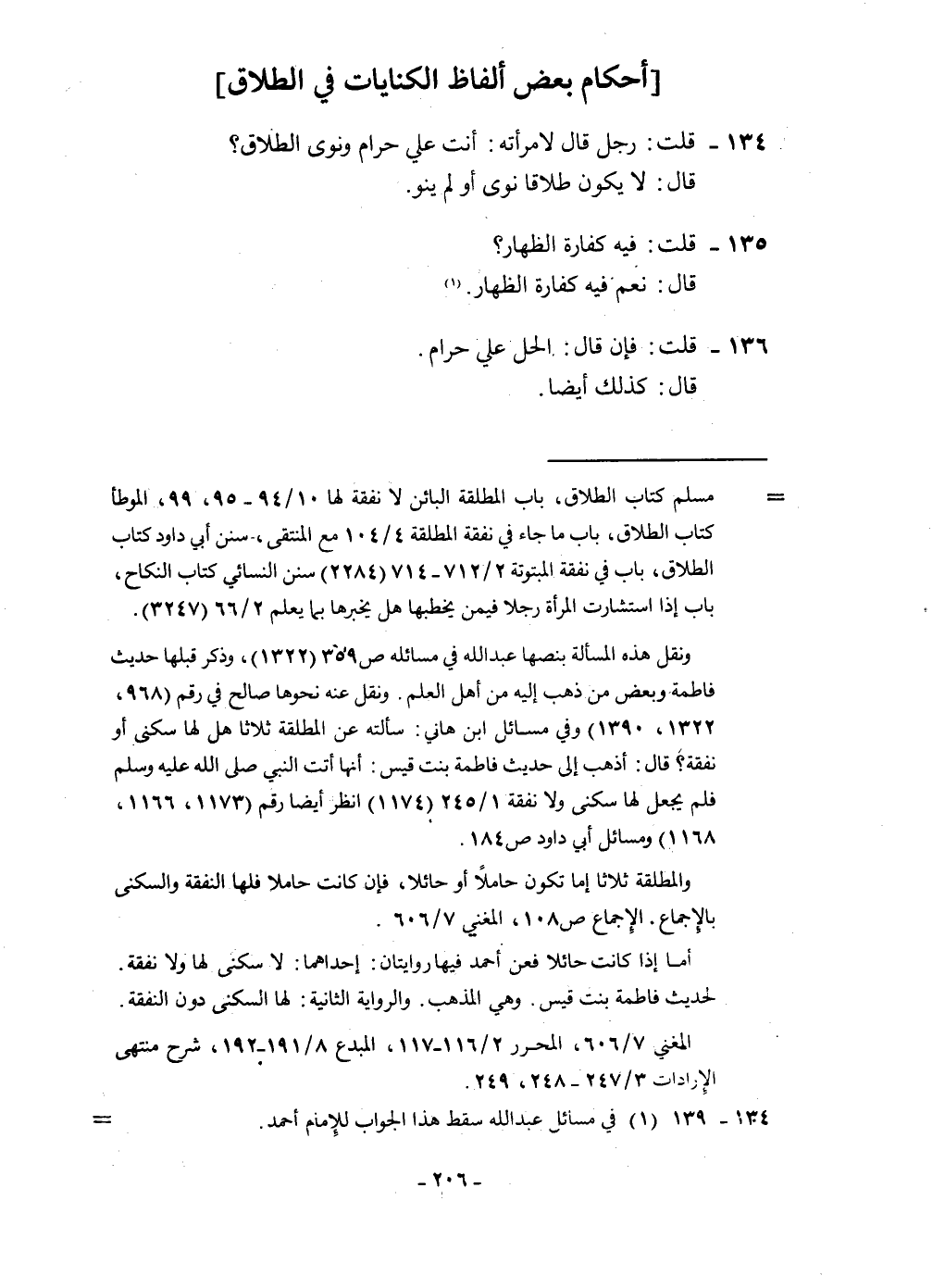 ١٣٤ - قلت رجل قَالَ لامْرَأَته أَنْت عَليّ حرَام وَنوى الطَّلَاق قَالَ لَا يكون طَلَاقا نوى أَو لم ينْو