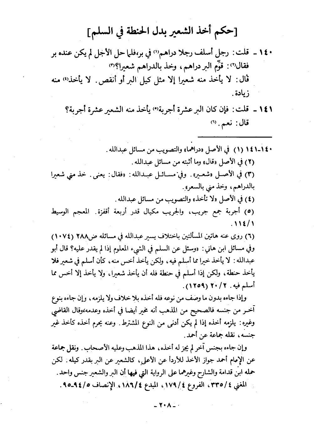 ١٤٠ - قلت رجل أسلف رجلا دَرَاهِم فِي بر فَلَمَّا حل الْأَجَل لم يكن عِنْده بر فَقَالَ قوم الْبر دَرَاهِم وَخذ بِالدَّرَاهِمِ شَعِيرًا قَالَ لَا يَأْخُذ مِنْهُ شَعِيرًا إِلَّا مثل كيل الْبر أَو أنقص لَا يَأْخُذ مِنْهُ زِيَادَة