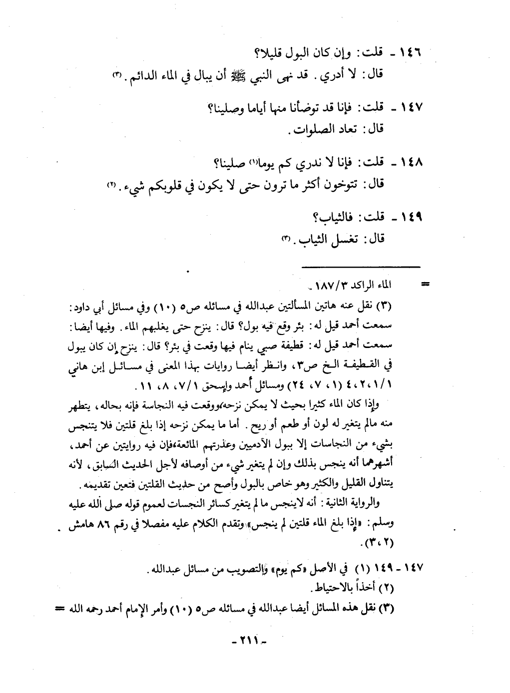 ١٤٦ - قلت وَإِن كَانَ الْبَوْل قَلِيلا قَالَ لَا أَدْرِي قد نهى النَّبِي صلى الله عَلَيْهِ وَسلم أَن يبال فِي المَاء الدَّائِم