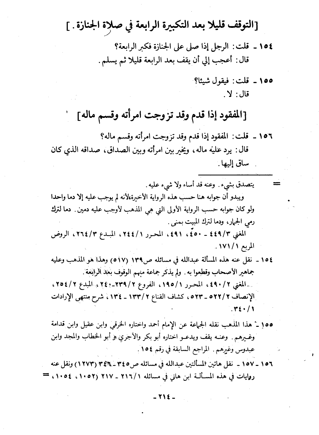 ١٥٦ - قلت الْمَفْقُود إِذا قدم وَقد تزوجت امْرَأَته وَقسم مَاله قَالَ يرد عَلَيْهِ مَاله وَيُخَير بَين امْرَأَته وَبَين الصَدَاق صداقه الَّذِي كَانَ سَاق إِلَيْهَا