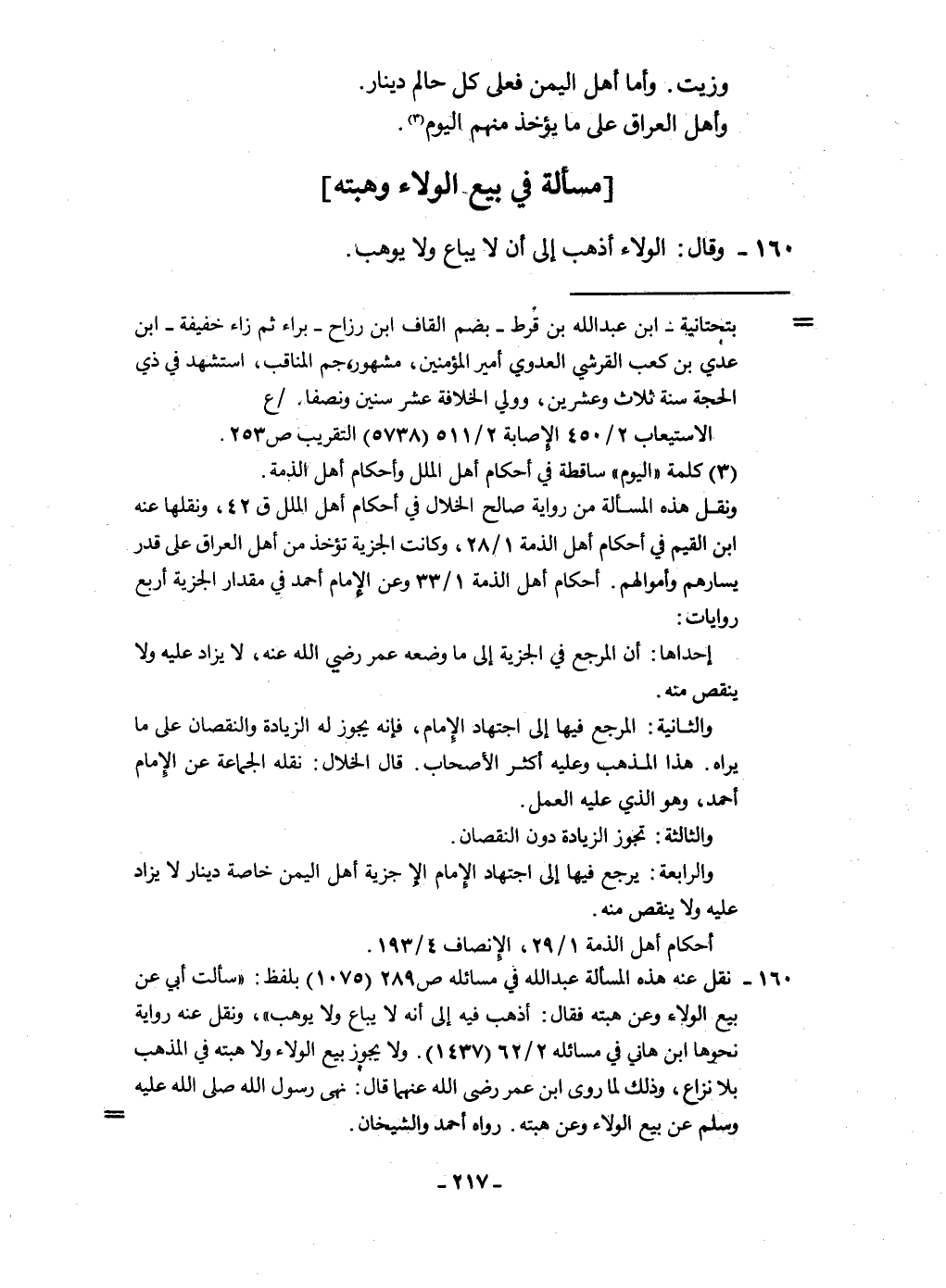 ١٦٠ - وَقَالَ الْوَلَاء أذهب إِلَى أَن لَا يُبَاع وَلَا يُوهب