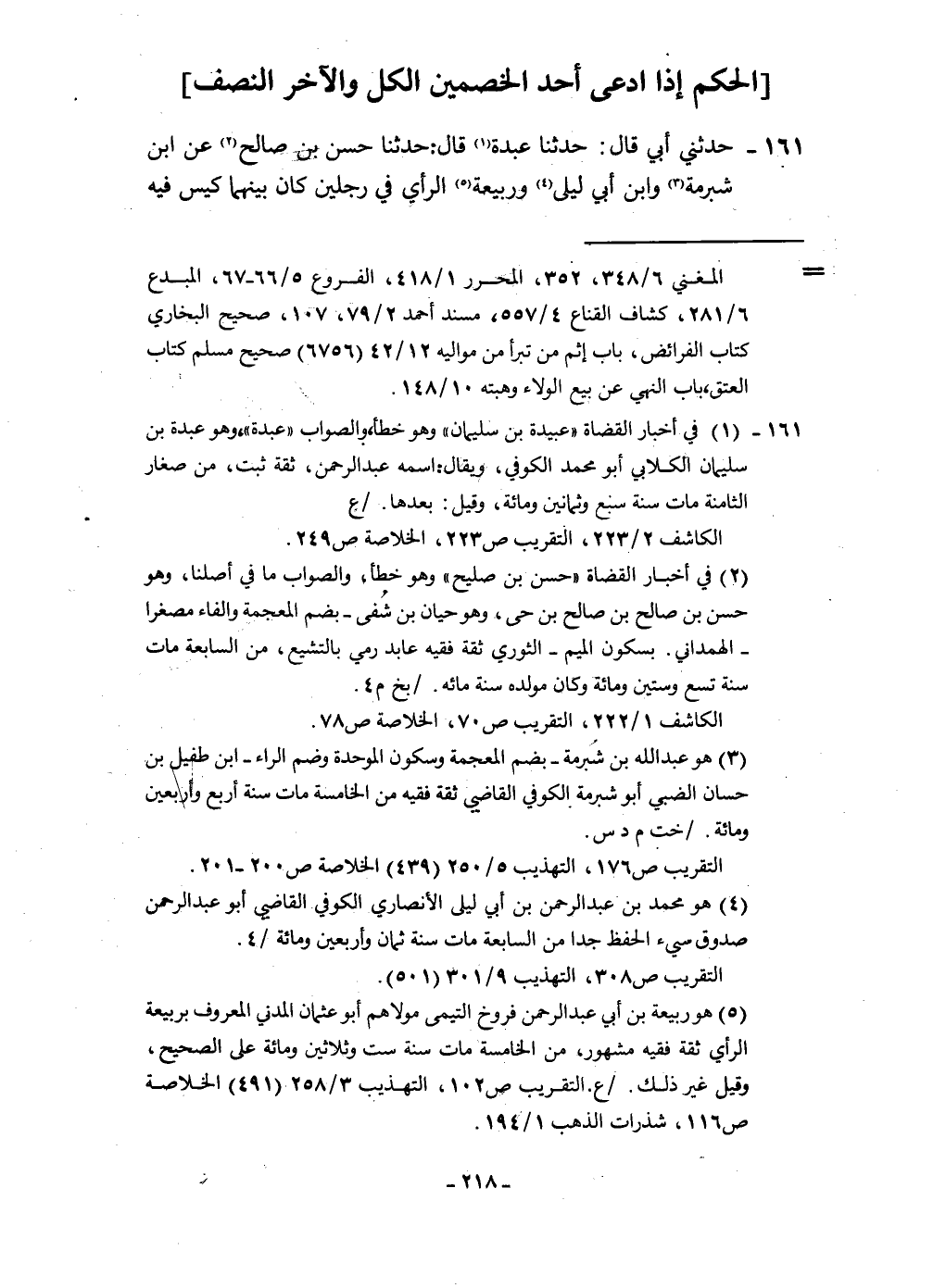 ١٦١ - حَدثنِي أبي قَالَ حَدثنَا عَبدة قَالَ حَدثنَا حسن بن صَالح عَن ابْن شبْرمَة وَابْن أبي ليلى وَرَبِيعَة الرَّأْي فِي رجلَيْنِ كَانَ بَينهمَا كيس فِيهِ