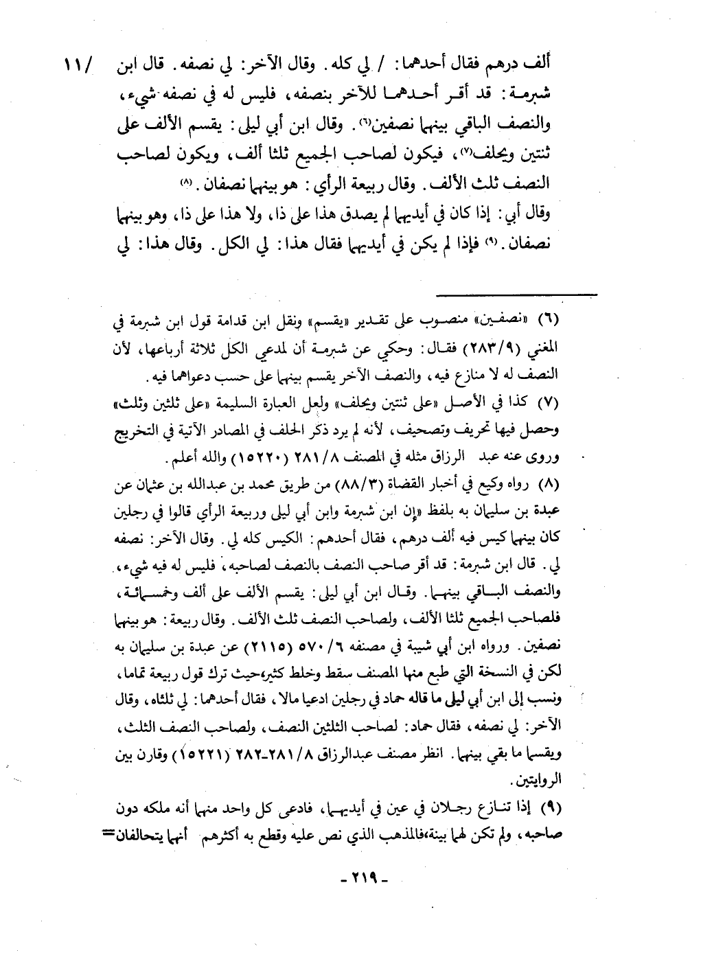 ألف دِرْهَم فَقَالَ أَحدهمَا لي كُله وَقَالَ الآخر لي نصفه قَالَ ابْن شبْرمَة قد أقرّ أَحدهمَا للْآخر بِنصفِهِ فَلَيْسَ لَهُ فِي نصفه شَيْء وَالنّصف الْبَاقِي بَينهمَا نِصْفَيْنِ وَقَالَ ابْن أبي ليلى يقسم الْألف على ثِنْتَيْنِ وَيحلف فَيكون لصَاحب الْجَمِيع ثلثا ألف وَيكون لصَاحب النّصْف ثلث الْألف وَقَالَ ربيعَة الرَّأْي هُوَ بَينهمَا نِصْفَيْنِ وَقَالَ أبي إِذا كَانَ فِي أَيْدِيهِمَا لم يصدق هَذَا على ذَا وَلَا هَذَا على ذَا وَهُوَ بَينهمَا نِصْفَانِ فَإِذا لم يكن فِي أَيْدِيهِمَا فَقَالَ هَذَا لي الْكل وَقَالَ هَذَا لي