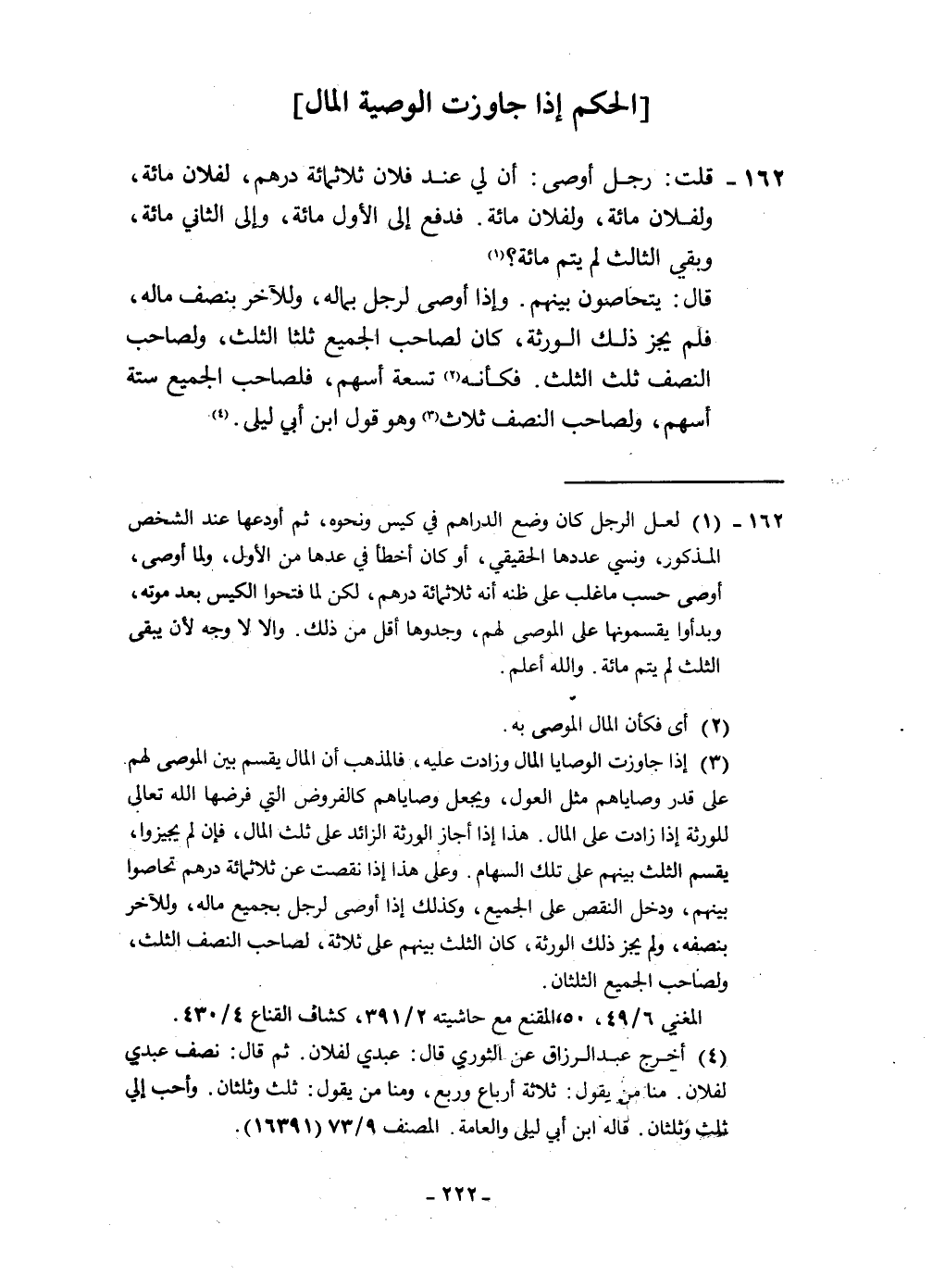 ١٦٢ - قلت رجل أوصى أَن لي عِنْد فلَان ثَلَاثمِائَة دِرْهَم لفُلَان مائَة وَلفُلَان مائَة وَلفُلَان مائَة فَدفع إِلَى الأول مائَة وَإِلَى الثَّانِي مائَة وَبَقِي الثَّالِث لم يتم مائَة قَالَ يتحاصون بَينهم وَإِذا أوصى لرجل بِمَالِه وَللْآخر بِنصْف مَاله فَلم يجز ذَلِك الْوَرَثَة وَكَانَ لصَاحب الْجَمِيع ثلثا الثُّلُث وَلِصَاحِب النّصْف ثلث الثُّلُث فَكَأَنَّهُ تِسْعَة أسْهم فَلصَاحِب الْجَمِيع سِتَّة أسْهم وَلِصَاحِب النّصْف ثَلَاث وَهُوَ قَول ابْن أبي ليلى