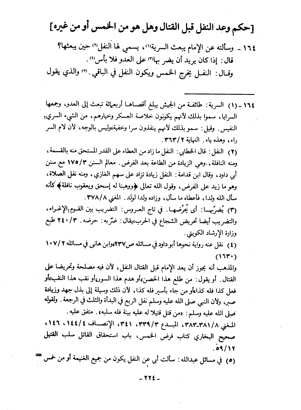 ١٦٤ - وَسَأَلته عَن الإِمَام يبْعَث السّريَّة يُسَمِّي لَهَا النَّفْل حِين يبعثها قَالَ إِذا كَانَ يُرِيد أَن يضر بهَا على الْعَدو فَلَا بَأْس وَقَالَ النَّفْل يخرج الْخمس وَيكون النَّفْل فِي الْبَاقِي وَالَّذِي يَقُول