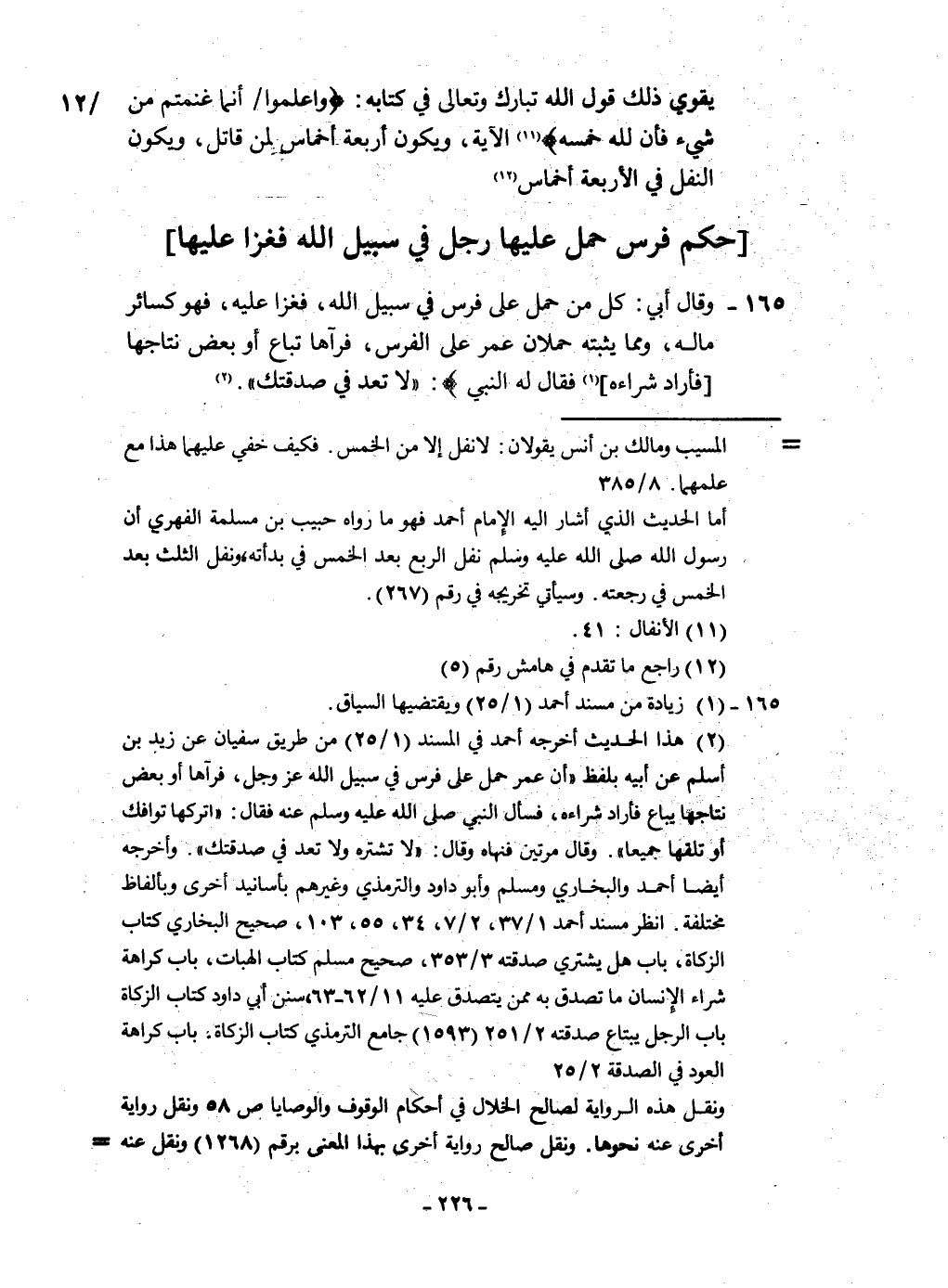 ١٦٥ - وَقَالَ أبي كل من حمل على فرس فِي سَبِيل الله فغزا عَلَيْهِ فَهُوَ كَسَائِر مَاله وَمِمَّا يُثبتهُ حملان عمر على الْفرس فرآها تبَاع أَو بعض نتاجها فَأَرَادَ شِرَاءَهُ فَقَالَ لَهُ النَّبِي لَا تعد فِي صدقتك