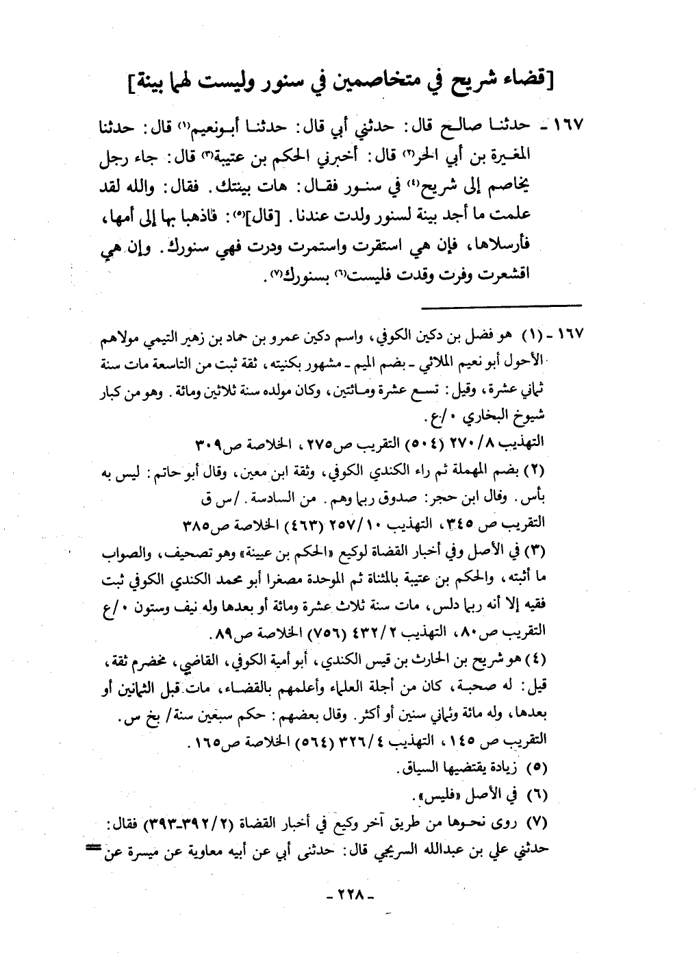 ١٦٧ - حَدثنَا صَالح قَالَ حَدثنِي أبي قَالَ حَدثنَا أَبُو نعيم قَالَ حَدثنَا الْمُغيرَة بن أبي الْحر قَالَ أَخْبرنِي الحكم بن عتيبة قَالَ جَاءَ رجل يُخَاصم إِلَى شُرَيْح فِي سنور فَقَالَ هَات بينتك فَقَالَ وَالله لقد علمت مَا أجد بَيِّنَة لسنور ولدت عندنَا قَالَ فاذهبا بهَا إِلَى أمهَا فأرسلاها فَإِن هِيَ اسْتَقَرَّتْ واستمرت وَدرت فَهِيَ سنورك وَإِن هِيَ اقشعرت وفرت وقدت فَلَيْسَتْ بسنورك