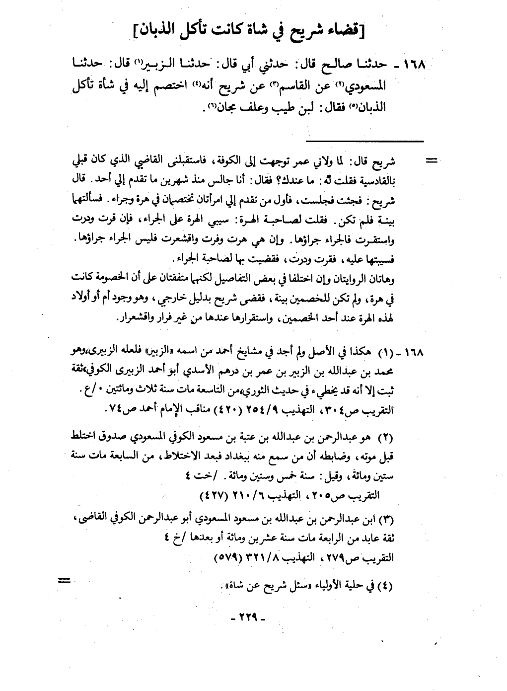 ١٦٨ - حَدثنَا صَالح قَالَ حَدثنِي أبي قَالَ حَدثنَا الزبير قَالَ حَدثنَا المَسْعُودِيّ عَن الْقَاسِم عَن شُرَيْح أَنه اخْتصم إِلَيْهِ فِي شأة تَأْكُل الذبان فَقَالَ لبن طيب وعلف مجان