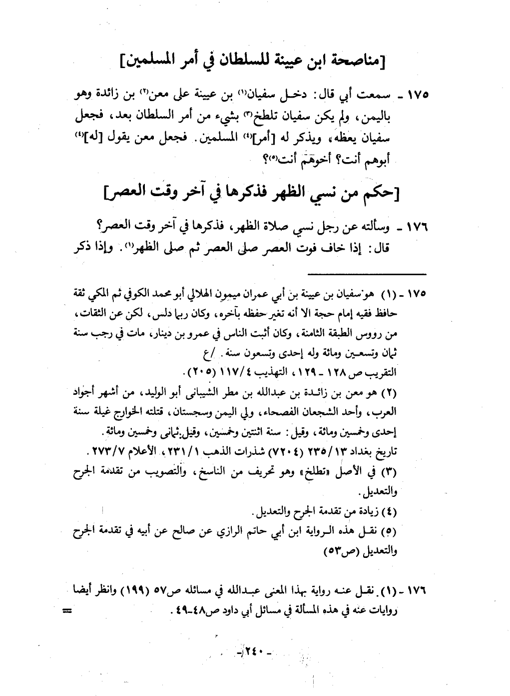 ١٧٥ - سَمِعت أبي قَالَ دخل سُفْيَان بن عُيَيْنَة على معن بن زَائِدَة وَهُوَ بِالْيمن وَلم يكن سُفْيَان تلطخ بِشَيْء من أَمر السُّلْطَان بعد فَجعل سُفْيَان يعظه وَيذكر لَهُ أَمر الْمُسلمين فَجعل معن يَقُول لَهُ أبوهم أَنْت أخوهم أَنْت