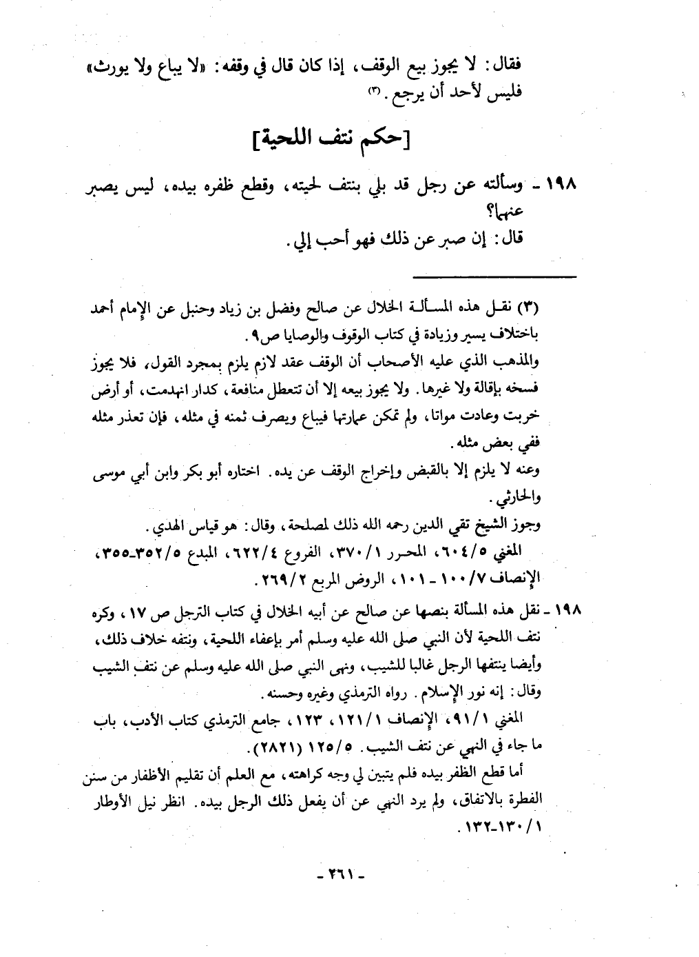 ١٩٨ - وَسَأَلته عَن رجل قد بلي بنتف لحيته وَقطع ظفره بِيَدِهِ لَيْسَ يصبر عَنْهُمَا قَالَ إِن صَبر على ذَلِك فَهُوَ أحب إِلَيّ