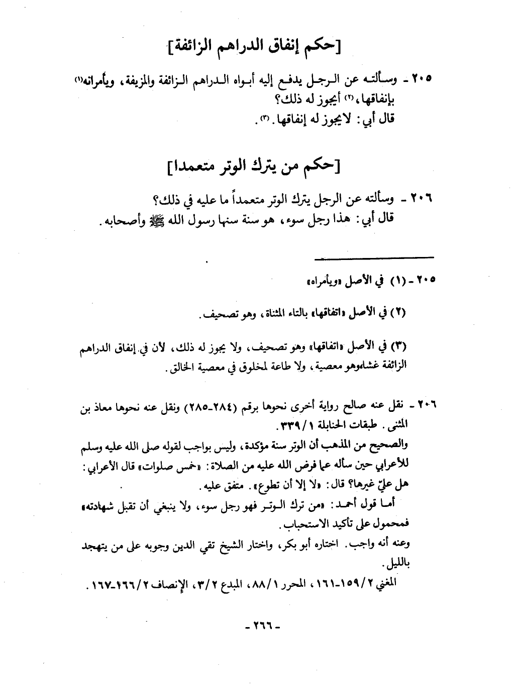 ٢٠٦ - وَسَأَلته عَن الرجل يتْرك الْوتر مُتَعَمدا مَا عَلَيْهِ فِي ذَلِك قَالَ أبي هَذَا رجل سوء هُوَ سنة سنّهَا رَسُول الله صلى الله عَلَيْهِ وَسلم وَأَصْحَابه