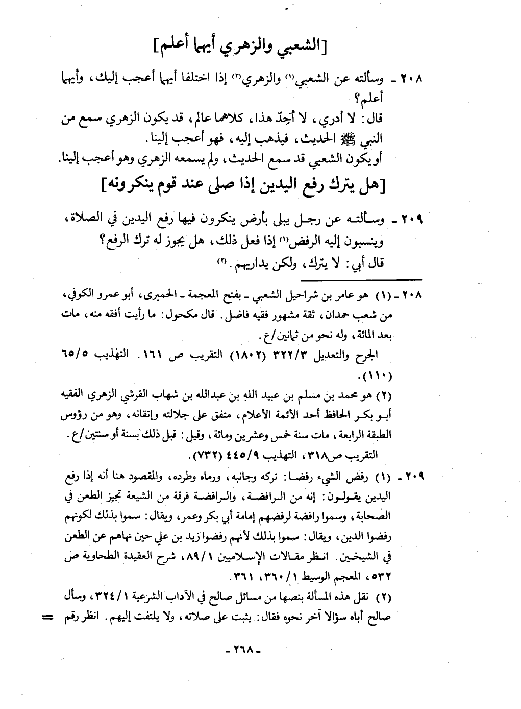 ٢٠٨ - وَسَأَلته عَن الشّعبِيّ وَالزهْرِيّ إِذا اخْتلفَا أَيهمَا أعجب إِلَيْك وَأيهمَا أعلم قَالَ لَا أَدْرِي لَا أحد هَذَا كِلَاهُمَا عَالم قد يكون الزُّهْرِيّ سمع من النَّبِي صلى الله عَلَيْهِ وَسلم الحَدِيث فَيذْهب إِلَيْهِ فَهُوَ أعجب إِلَيْنَا أَو يكون الشّعبِيّ قد سمع الحَدِيث وَلم يسمعهُ الزُّهْرِيّ وَهُوَ أعجب إِلَيْنَا