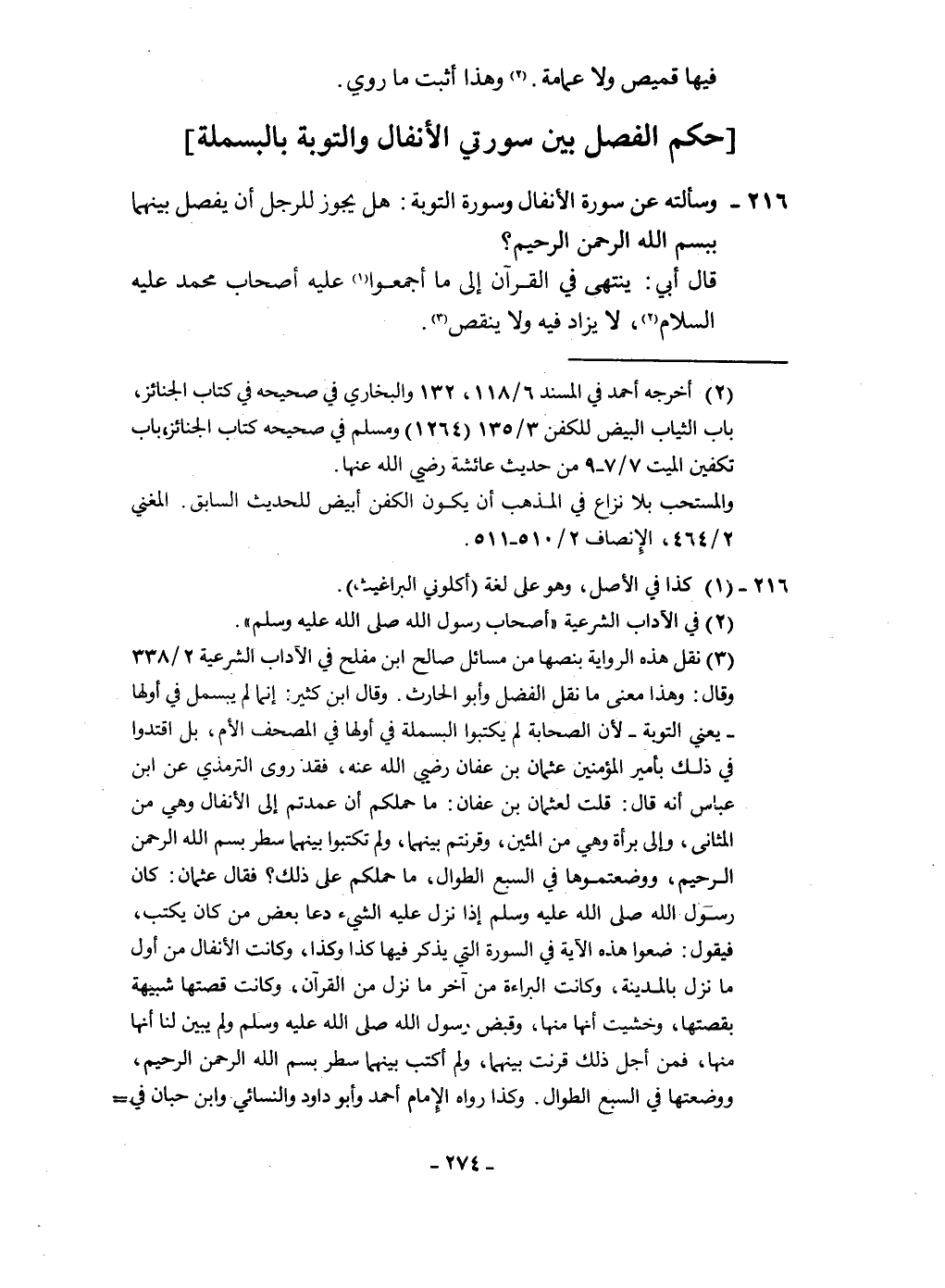 ٢١٦ - وَسَأَلته عَن سُورَة الْأَنْفَال وَسورَة التَّوْبَة هَل يجوز للرجل أَن يفصل بَينهمَا بِبسْم الله الرَّحْمَن الرَّحِيم قَالَ أبي ينتهى فِي الْقُرْآن إِلَى مَا أَجمعُوا عَلَيْهِ أَصْحَاب مُحَمَّد عَلَيْهِ السَّلَام لَا يُزَاد فِيهِ وَلَا ينقص