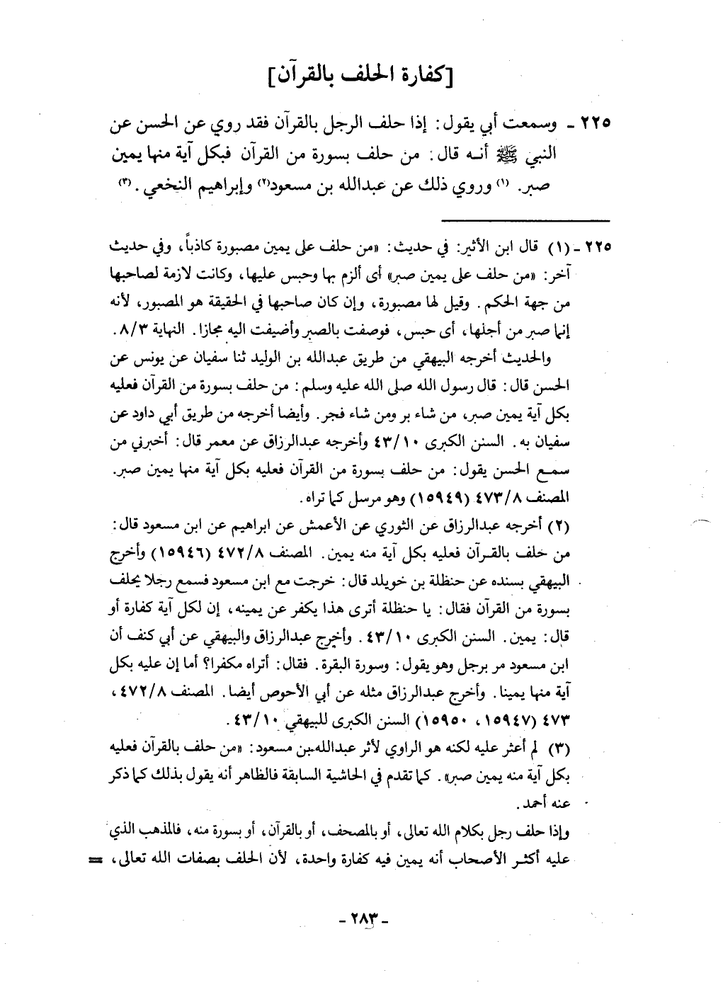 ٢٢٥ - وَسمعت أبي يَقُول إِذا حلف الرجل بِالْقُرْآنِ فقد رُوِيَ عَن الْحسن عَن النَّبِي صلى الله عَلَيْهِ وَسلم أَنه قَالَ من حلف بِسُورَة من الْقُرْآن فبكل آيَة مِنْهَا يَمِين صَبر وَرُوِيَ ذَلِك عَن عبد الله بن مَسْعُود وَإِبْرَاهِيم النَّخعِيّ
