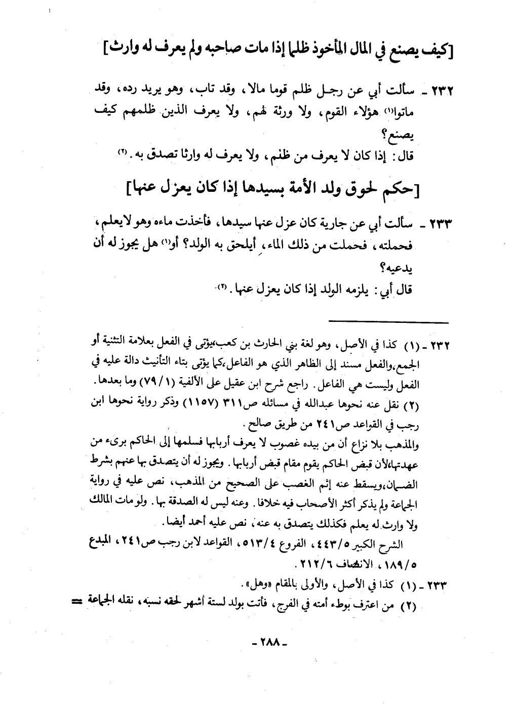 ٢٣٢ - سَأَلت أبي عَن رجل ظلم قوما مَالا وَقد تَابَ وَهُوَ يُرِيد رده وَقد مَاتُوا هَؤُلَاءِ الْقَوْم وَلَا وَرَثَة لَهُم وَلَا يعرف الَّذين ظلمهم كَيفَ يصنع قَالَ إِذا كَانَ لَا يعرف من ظلم وَلَا يعرف لَهُ وَارِثا تصدق بِهِ
