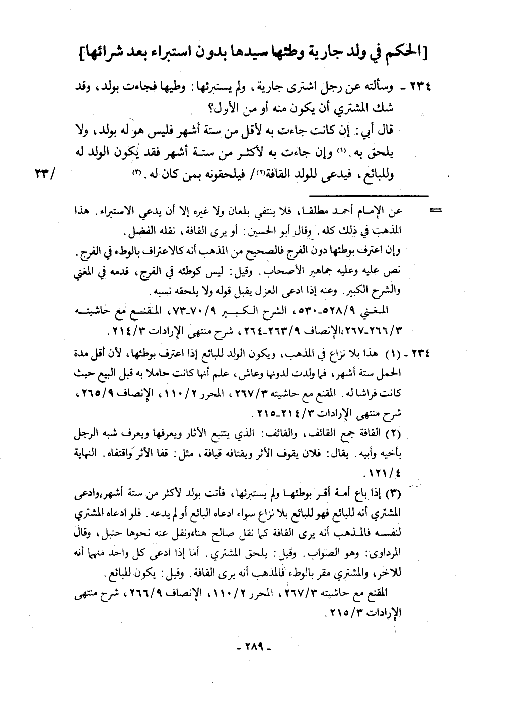 ٢٣٤ - وَسَأَلته عَن رجل اشْترى جَارِيَة وَلم يَسْتَبْرِئهَا وطيها فَجَاءَت بِولد وَقد شكّ المُشْتَرِي أَن يكون مِنْهُ أَو من الأول قَالَ أبي إِن كَانَت جَاءَت بِهِ لأَقل من سِتَّة أشهر فَلَيْسَ هُوَ لَهُ بِولد وَلَا يلْحق بِهِ وَإِن جَاءَت بِهِ لأكْثر من سِتَّة أشهر فقد يكون الْوَلَد لَهُ وَللْبَائِع فيدعى للْوَلَد الْقَافة فيلحقون بِمن كَانَ لَهُ