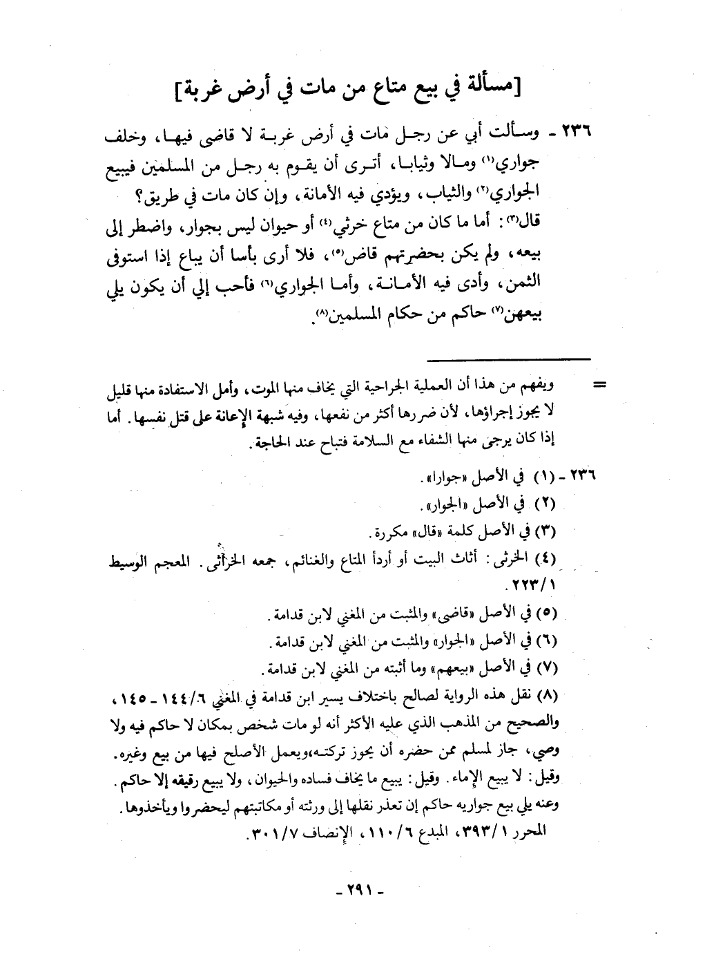 ٢٣٦ - وَسَأَلت أبي عَن رجل مَاتَ فِي أَرض غربَة لَا قَاضِي فِيهَا وَخلف جواري ومالا وثيابا أَتَرَى أَن يقوم بِهِ رجل من الْمُسلمين فيبيع الْجَوَارِي وَالثيَاب وَيُؤَدِّي فِيهِ الْأَمَانَة وَإِن كَانَ مَاتَ فِي طَرِيق قَالَ أما مَا كَانَ من مَتَاع خرثي أَو حَيَوَان لَيْسَ بجوار واضطر إِلَى بَيْعه وَلم يكن بحضرتهم قَاض فَلَا أرى بَأْسا أَن يُبَاع إِذا استوفى الثّمن وَأدّى فِيهِ الْأَمَانَة وَأما الْجَوَارِي فَأحب إِلَيّ أَن يكون يَلِي بيعهنَّ حَاكم من حكام الْمُسلمين