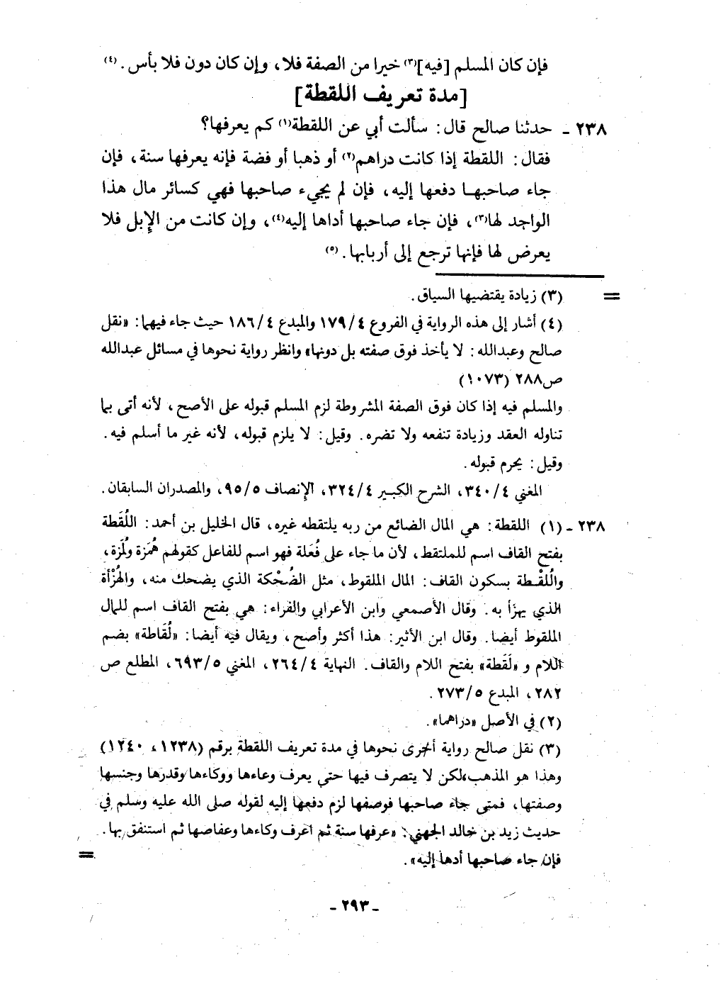 ٢٣٨ - حَدثنَا صَالح قَالَ سَأَلت أبي عَن اللّقطَة كم يعرفهَا فَقَالَ اللّقطَة إِذا كَانَت دَرَاهِم أَو ذَهَبا أَو فضَّة فَإِنَّهُ يعرفهَا سنة فَإِن جَاءَ صَاحبهَا دَفعهَا إِلَيْهِ فَإِن لم يَجِيء صَاحبهَا فَهِيَ كَسَائِر مَال هَذَا الْوَاجِد لَهَا فَإِن جَاءَ صَاحبهَا أَدَّاهَا إِلَيْهِ وَإِن كَانَت من الْإِبِل فَلَا يعرض لَهَا فَإِنَّهَا ترجع إِلَى أَرْبَابهَا