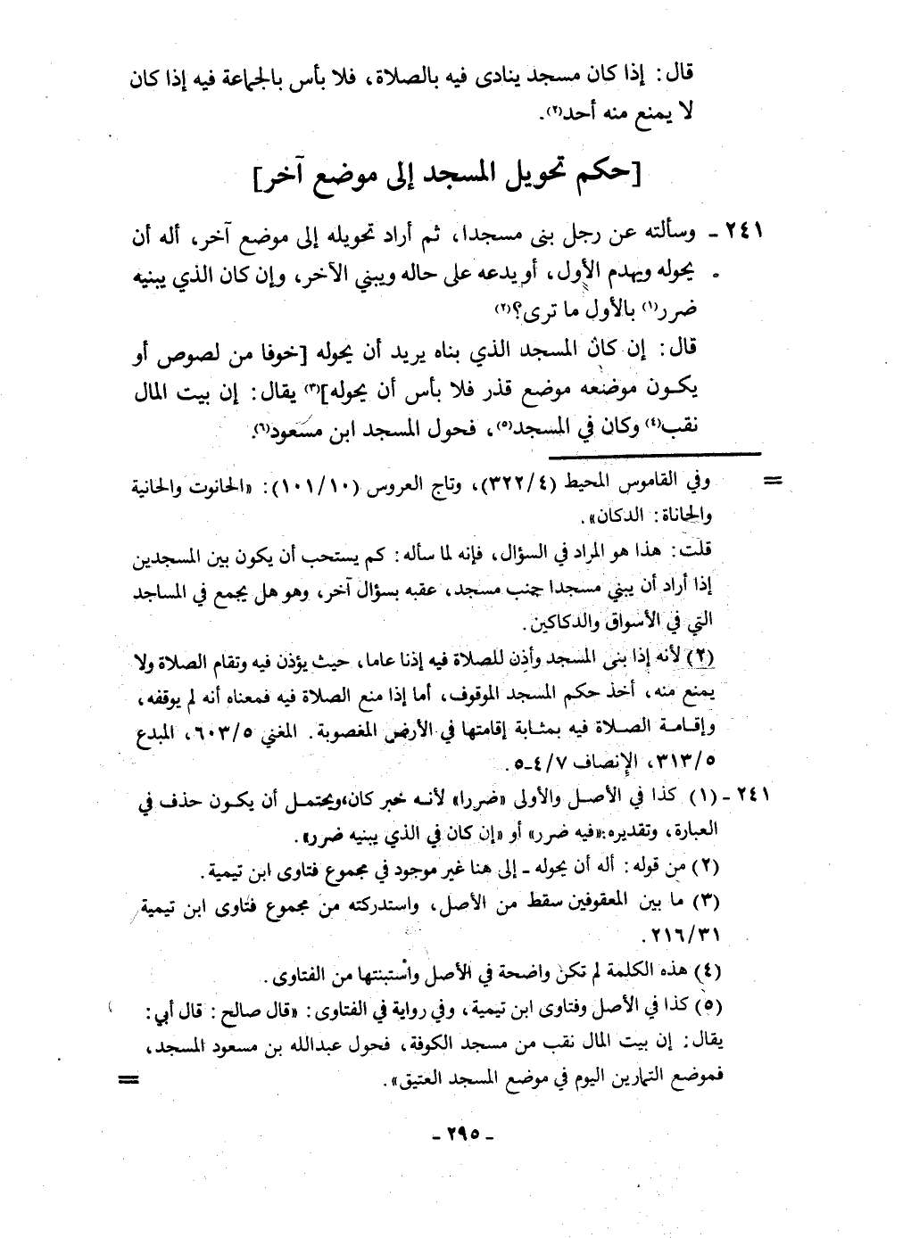 ٢٤١ - وَسَأَلته عَن رجل بنى مَسْجِدا ثمَّ أَرَادَ تحويله إِلَى مَوضِع آخر أَله أَن يحوله ويهدم الأول أَو يَدعه على حَاله وَيَبْنِي الآخر وَإِن كَانَ الَّذِي يبنيه ضَرَر بِالْأولِ مَا ترى قَالَ إِن كَانَ الْمَسْجِد الَّذِي بناه يُرِيد أَن يحوله خوفًا من لصوص أَو يكون مَوْضِعه مَوضِع قذر فَلَا بَأْس أَن يحوله يُقَال إِن بَيت المَال نقب وَكَانَ فِي الْمَسْجِد فحول الْمَسْجِد ابْن مَسْعُود
