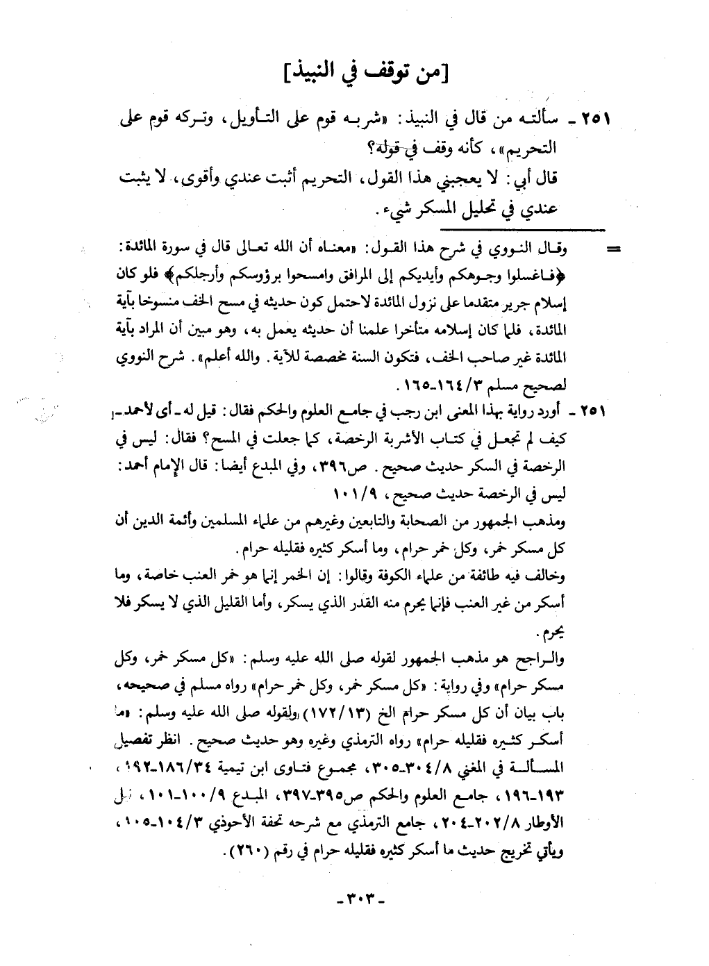 ٢٥١ - سَأَلته من قَالَ فِي النَّبِيذ شربه قوم على التَّأْوِيل وَتَركه قوم على التَّحْرِيم كَأَنَّهُ وقف فِي قَوْله قَالَ أبي لَا يُعجبنِي هَذَا القَوْل التَّحْرِيم أثبت عِنْدِي وَأقوى لَا يثبت عِنْدِي فِي تَحْلِيل الْمُسكر شَيْء