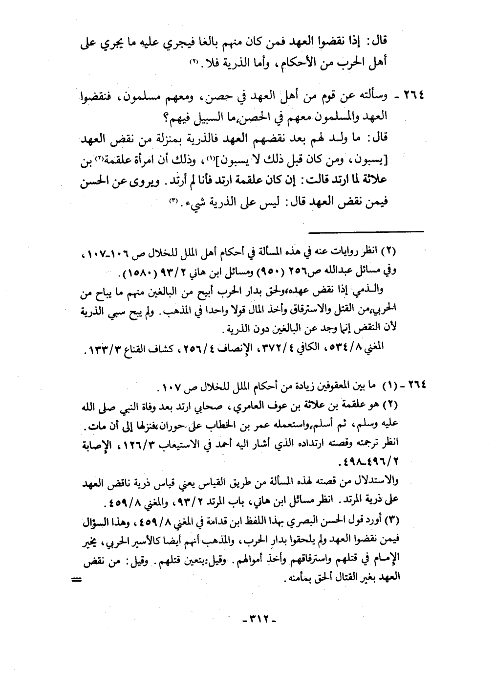 ٢٦٤ - وَسَأَلته عَن قوم من أهل الْعَهْد فِي حصن وَمَعَهُمْ مُسلمُونَ فنقضوا الْعَهْد والمسلمون مَعَهم فِي الْحصن مَا السَّبِيل فيهم قَالَ مَا ولد لَهُم بعد نقضهم الْعَهْد فالذرية بِمَنْزِلَة من نقض الْعَهْد يسبون وَمن كَانَ قبل ذَلِك لَا يسبون وَذَلِكَ أَن امْرَأَة عَلْقَمَة بن علاثة لما ارْتَدَّ قَالَت إِن كَانَ عَلْقَمَة ارْتَدَّ فَأَنا لم أرتد ويروى عَن الْحسن فِيمَن نقض الْعَهْد قَالَ لَيْسَ على الذُّرِّيَّة شَيْء