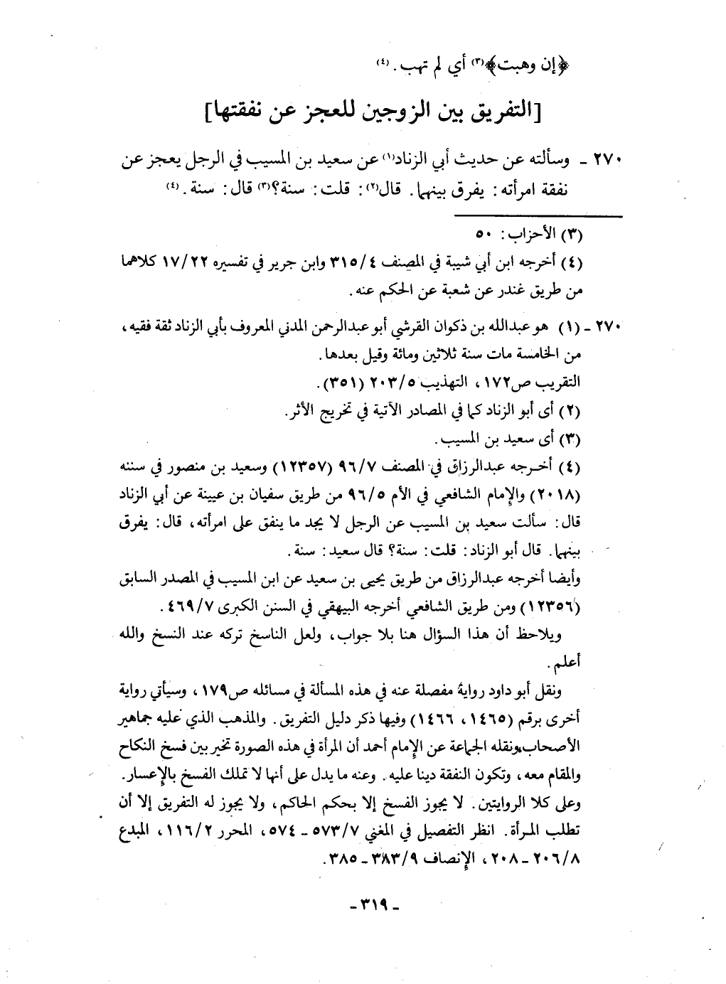 ٢٧٠ - وَسَأَلته عَن حَدِيث أبي الزِّنَاد عَن سعيد بن الْمسيب فِي الرجل يعجز عَن نَفَقَة امْرَأَته يفرق بَينهمَا قَالَ قلت سنة قَالَ سنة