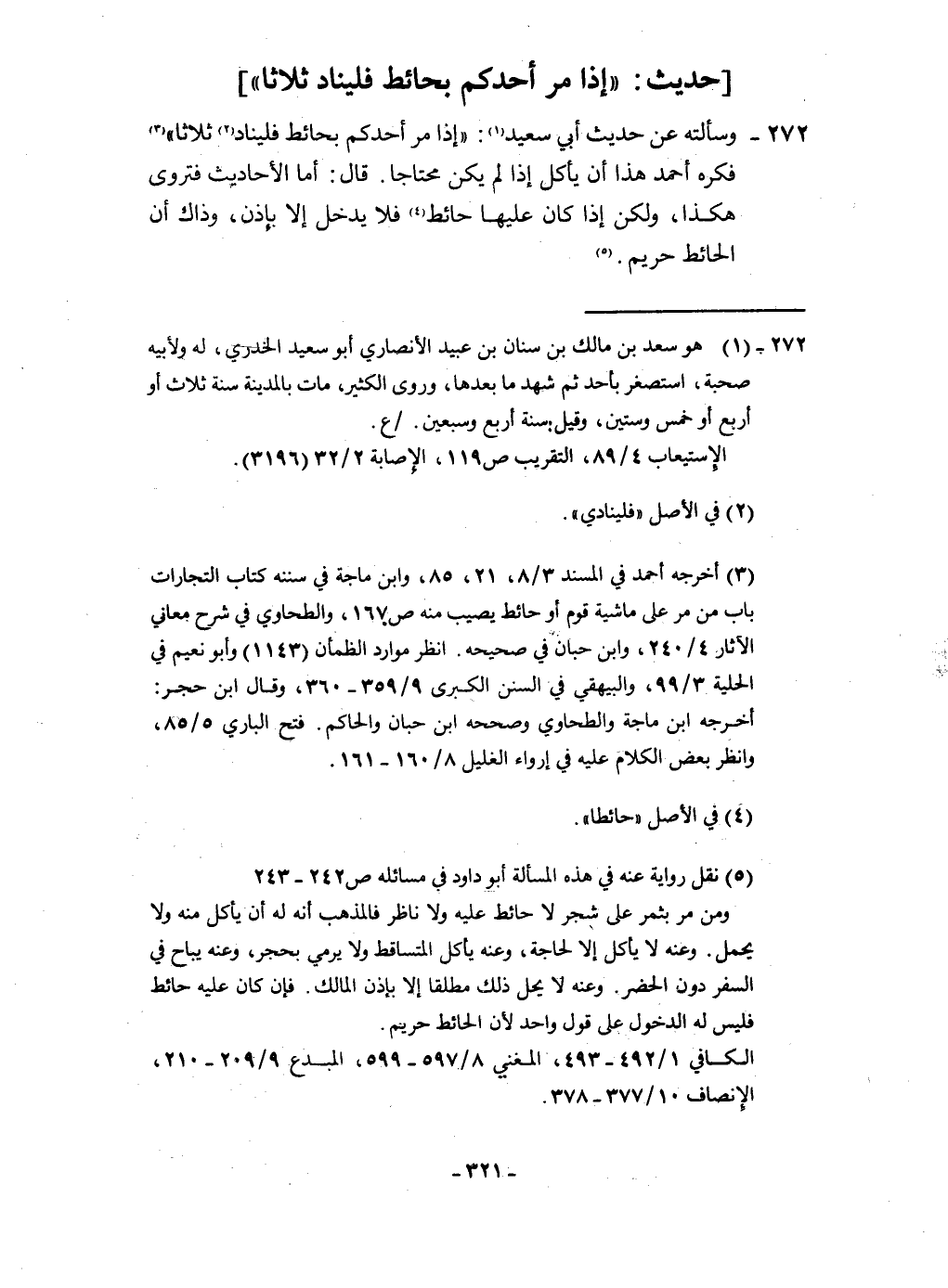 ٢٧٢ - وَسَأَلته عَن حَدِيث أبي سعيد إِذا مر أحدكُم بحائط فليناد ثَلَاثًا فكره أَحْمد هَذَا أَن يَأْكُل إِذا لم يكن مُحْتَاجا قَالَ أما الْأَحَادِيث فتروى هَكَذَا وَلَكِن إِذا كَانَ عَلَيْهَا حَائِط فَلَا يدْخل إِلَّا بِإِذن وَذَاكَ أَن الْحَائِط حَرِيم