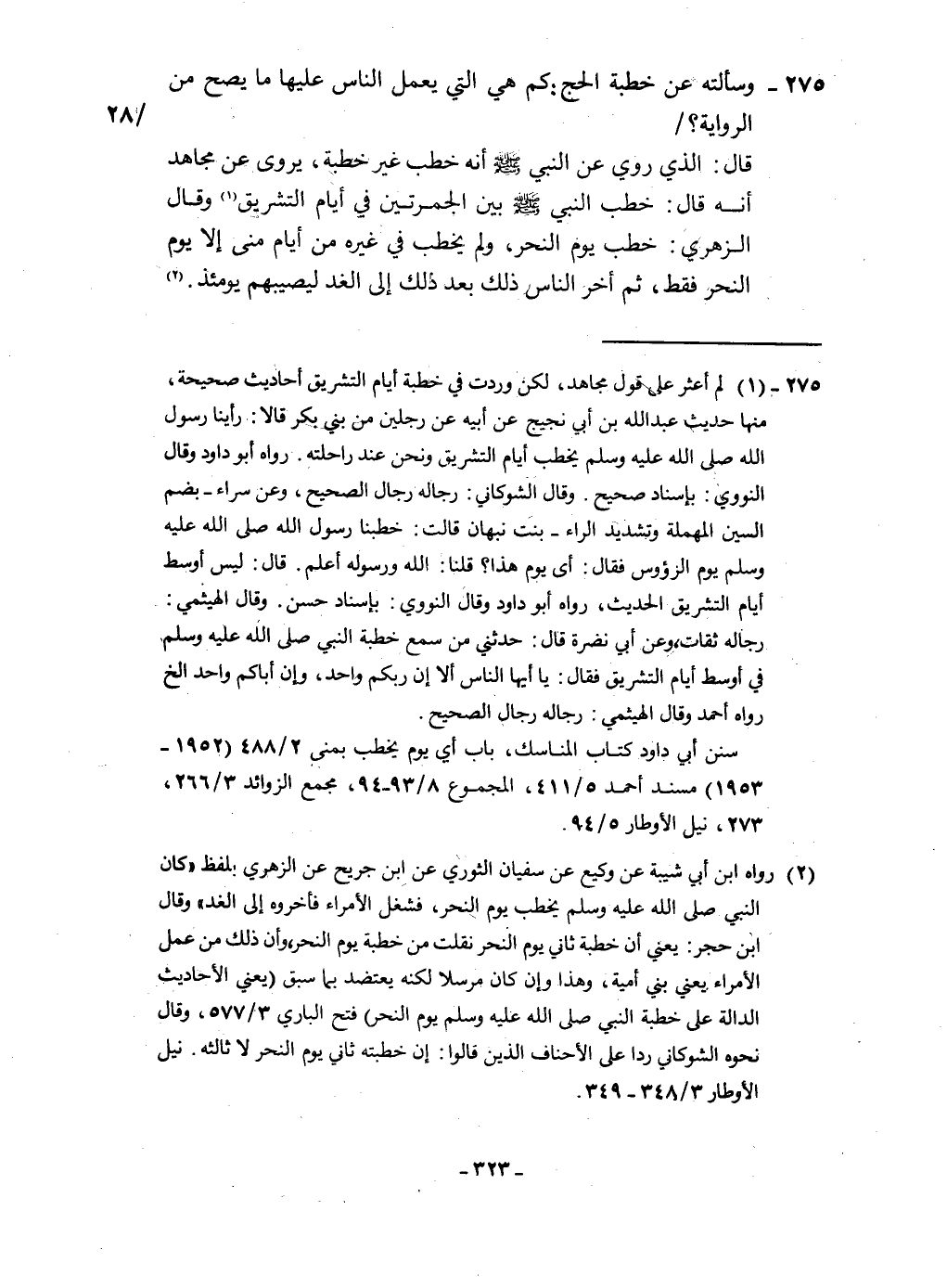 ٢٧٥ - وَسَأَلته عَن خطْبَة الْحَج كم هِيَ الَّتِي يعْمل النَّاس عَلَيْهَا مَا يَصح من الرِّوَايَة قَالَ الَّذِي رُوِيَ عَن النَّبِي صلى الله عَلَيْهِ وَسلم أَنه خطب غير خطْبَة يرْوى عَن مُجَاهِد أَنه قَالَ خطب النَّبِي صلى الله عَلَيْهِ وَسلم بَين الْجَمْرَتَيْن فِي أَيَّام التَّشْرِيق وَقَالَ الزُّهْرِيّ خطب يَوْم النَّحْر وَلم يخْطب فِي غَيره من أَيَّام منى إِلَّا يَوْم النَّحْر فَقَط ثمَّ أخر النَّاس ذَلِك بعد ذَلِك إِلَى الْغَد ليصيبهم يَوْمئِذٍ