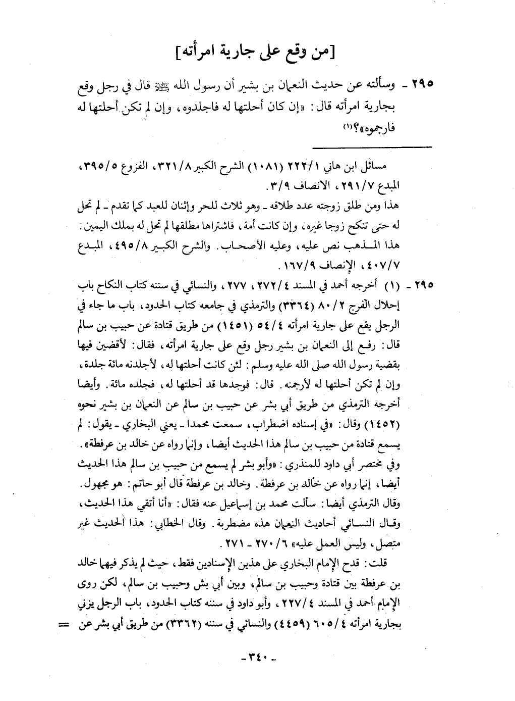 ٢٩٥ - وَسَأَلته عَن حَدِيث النُّعْمَان بن بشير أَن رَسُول الله صلى الله عَلَيْهِ وَسلم قَالَ فِي رجل وَقع بِجَارِيَة امْرَأَته قَالَ إِن كَانَ أحلتها لَهُ فاجلدوه وَإِن لم تكن أحلتها لَهُ فارجموه