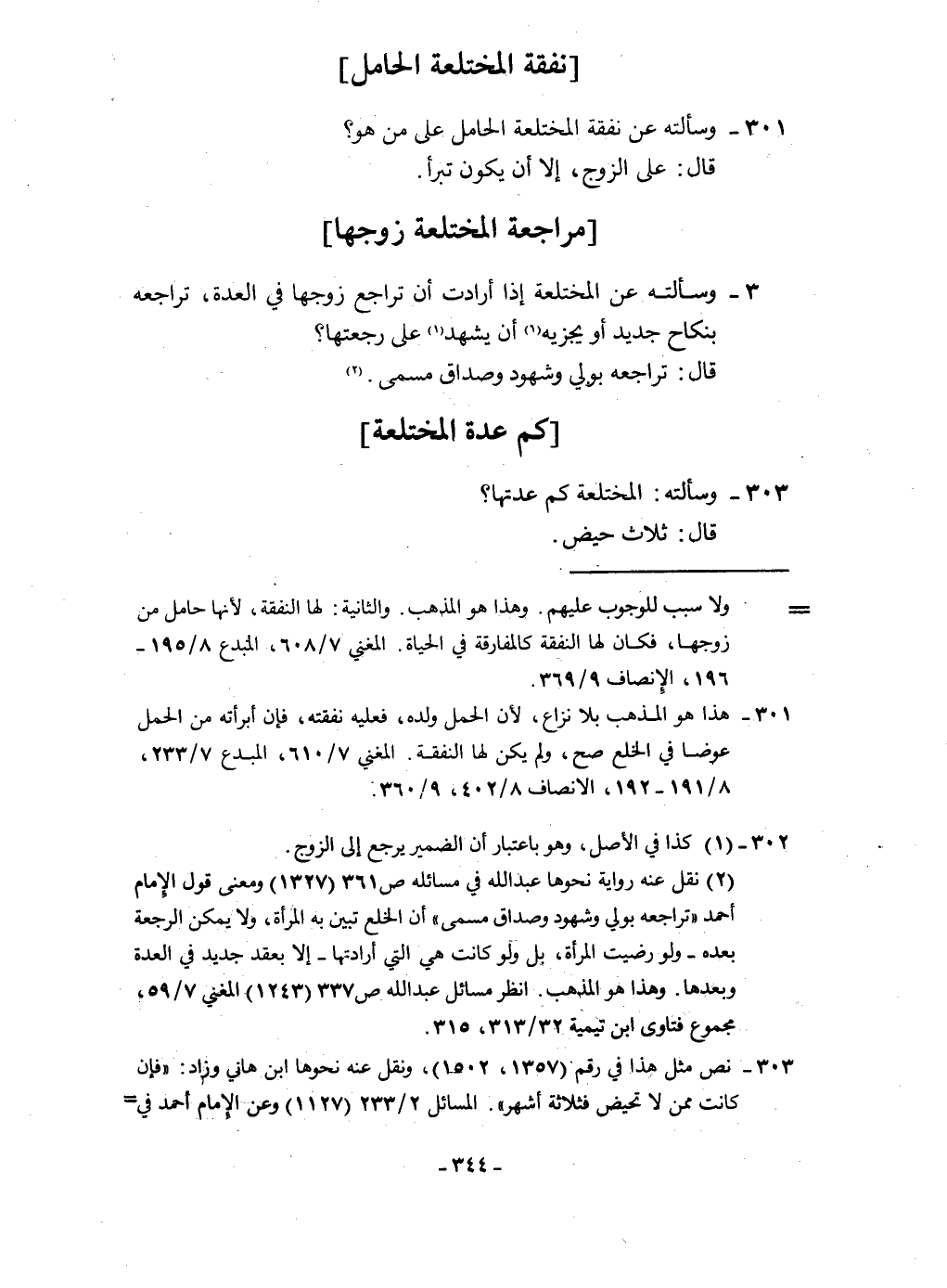 ٣٠٢ - وَسَأَلته عَن المختلعة إِذا أَرَادَت أَن تراجع زَوجهَا فِي الْعدة تراجعه بِنِكَاح جَدِيد أَو يجْزِيه أَن يشْهد على رَجعتهَا قَالَ تراجعه بولِي وشهود وصداق مُسَمّى