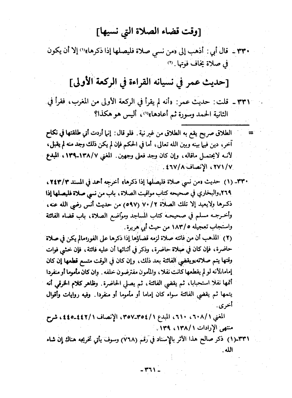 ٣٣٠ - قَالَ أبي أذهب إِلَى من نسي صَلَاة فليصلها إِذا ذكرهَا إِلَّا أَن يكون فِي صَلَاة يخَاف فَوتهَا