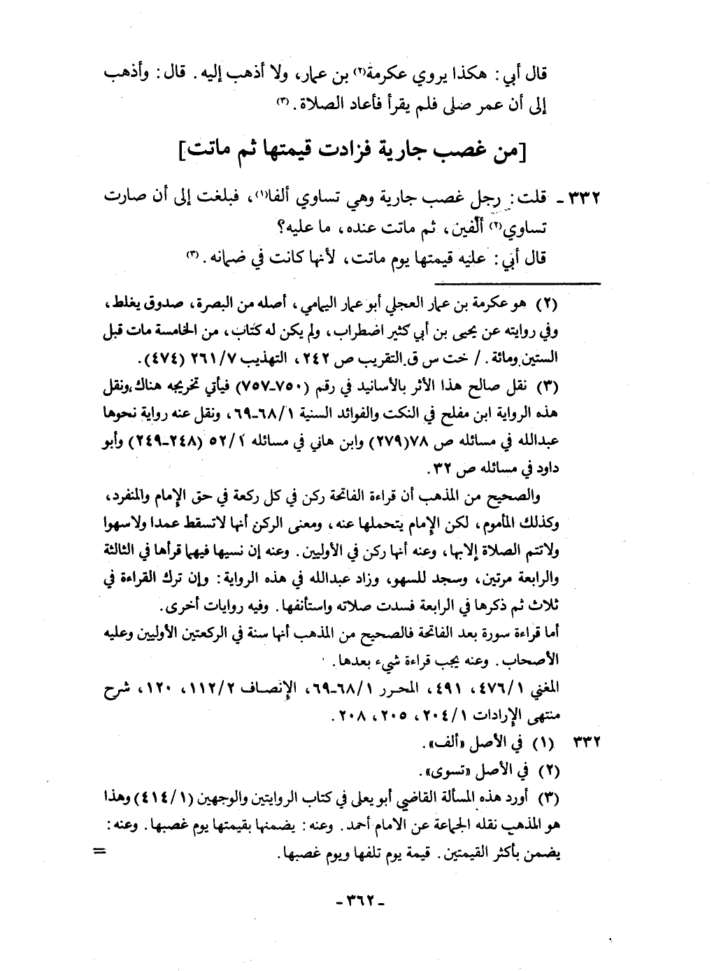 ٣٣٢ - قلت رجل غصب جَارِيَة وَهِي تَسَاوِي ألفا فبلغت إِلَى أَن صَارَت تَسَاوِي أَلفَيْنِ ثمَّ مَاتَت عِنْده مَا عَلَيْهِ قَالَ أبي عَلَيْهِ قيمتهَا يَوْم مَاتَت لِأَنَّهَا كَانَت فِي ضَمَانه